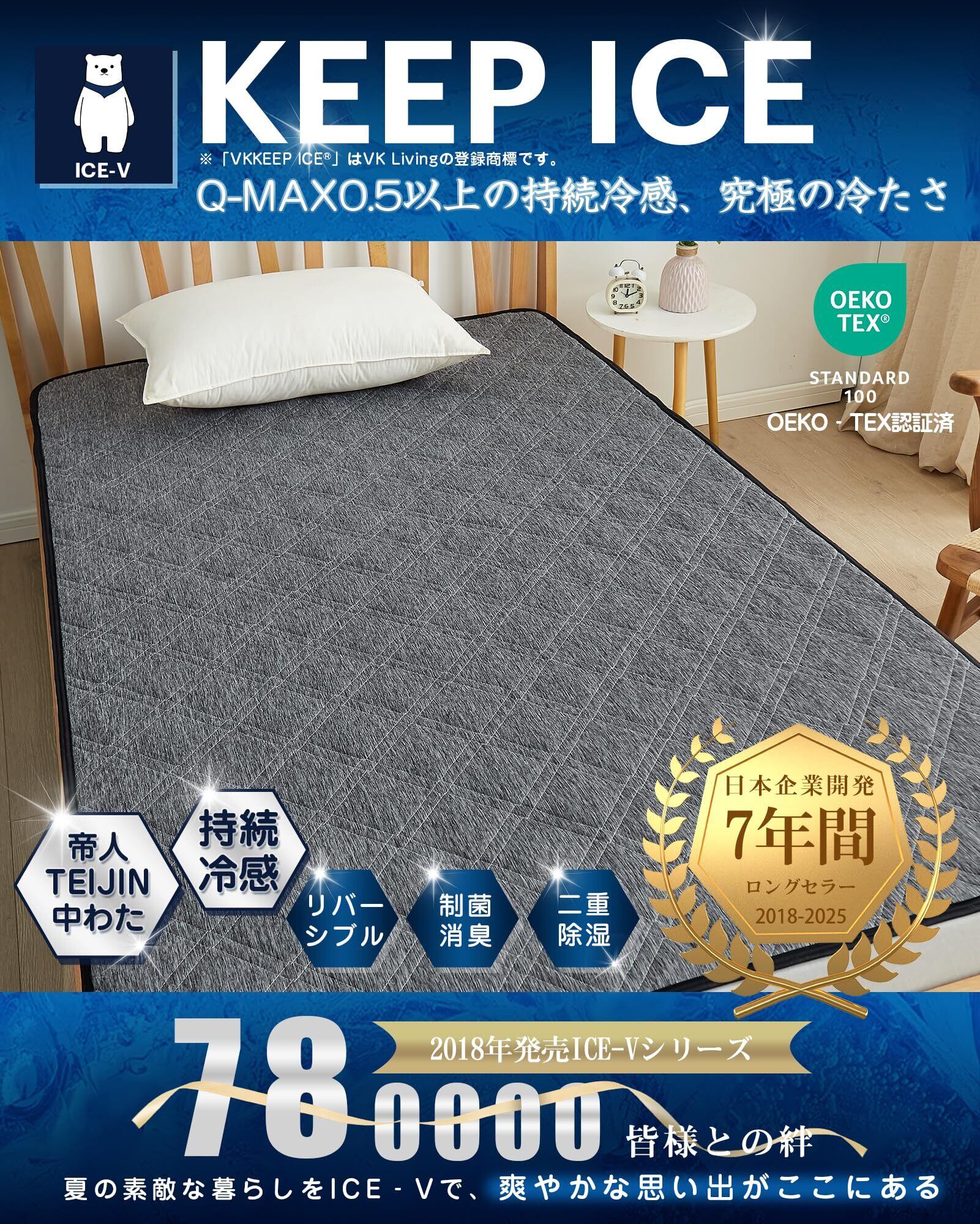【VKKEEPICE 糸冷感繊維】寝具業界最高峰のひんやり感Q-MAX0.56を実現!VKKEEPICE 糸は繊維界トップクラスの熱伝導率の高さを誇るPE素材を使用して、業界最高レベルの冷たさを実現しました。触れた時の冷たさだけではなく、深部体温が下がることで、ずっと『ちょうどいい』冷たさをキープ、朝までひんやり持続。暑がりさんも朝までぐっすり。