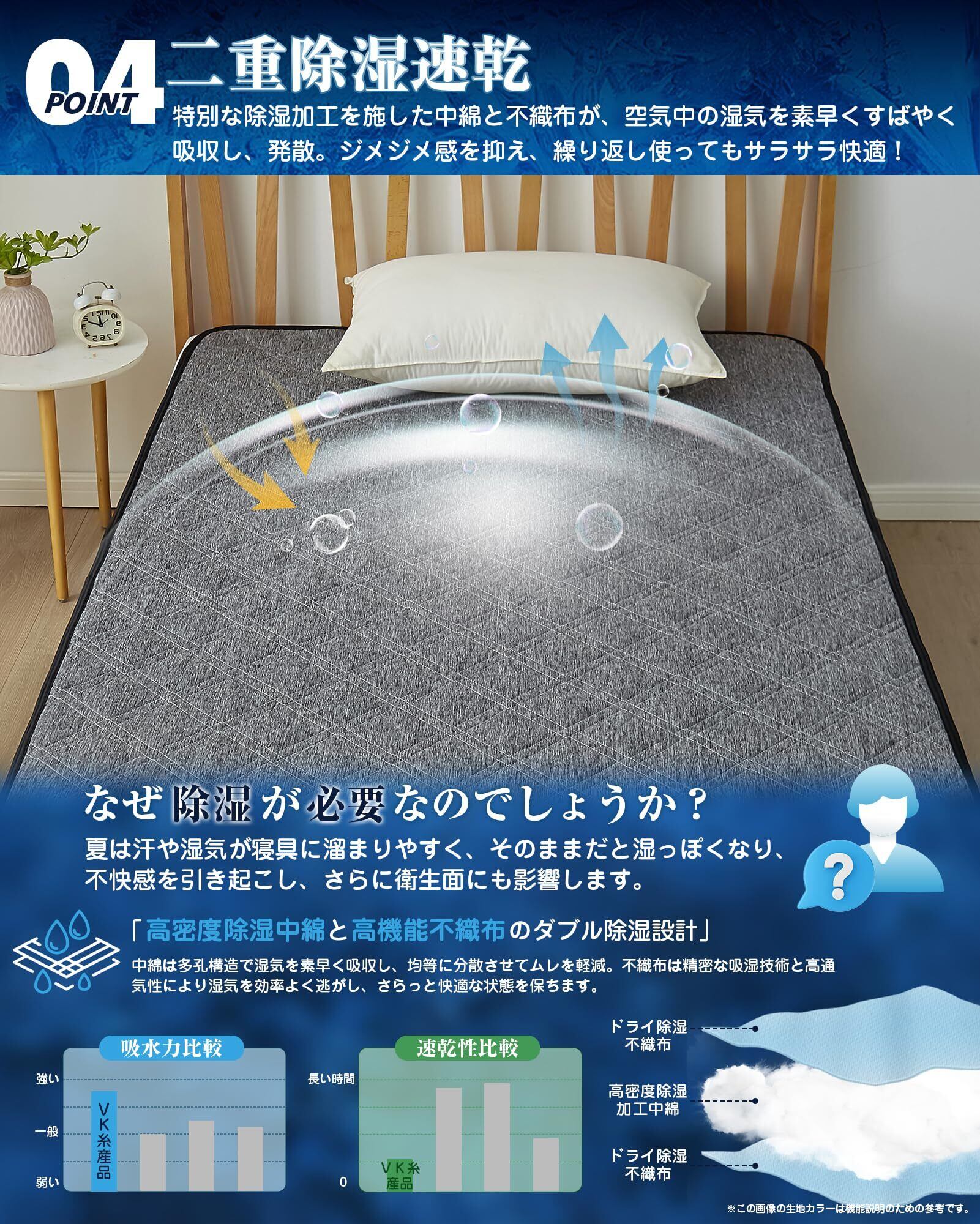 【二重除湿速乾】夏の寝苦しさは、温度だけでなく、湿気も夏の寝苦しさの要因となる。特別な除湿加工を施した中綿と不織布が、空気中の湿気を素早く吸収し、発散する。湿度を50±5%に近づけることでじめじめ感を解消、繰り返し使ってもサラサラ快適!
