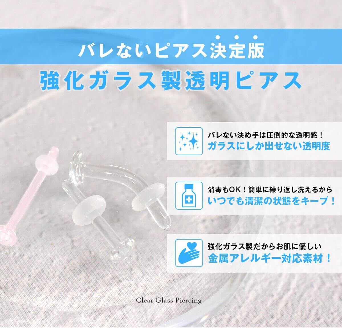 【透明感ガラスで目立たせない】 ガラスならではの美しい透明度でお肌に馴染んでホールキープ!どんな角度や距離でもバレたくない!そんな時に必須のガラスピアス シンプルなデザイン、つけっぱなしにできる事もあり、メンズ・レディースを問わずお使いいただけます。強化ガラスを使用した圧倒的な透明度で目立ちにくいピアスです。お肌に自然と馴染んで、ホールをキープしたい方にはばれずに着用可能です。職場や学校、正式な場所などピアスホールを隠さなければならない時やリテーナーとしても大活躍でおすすめです。