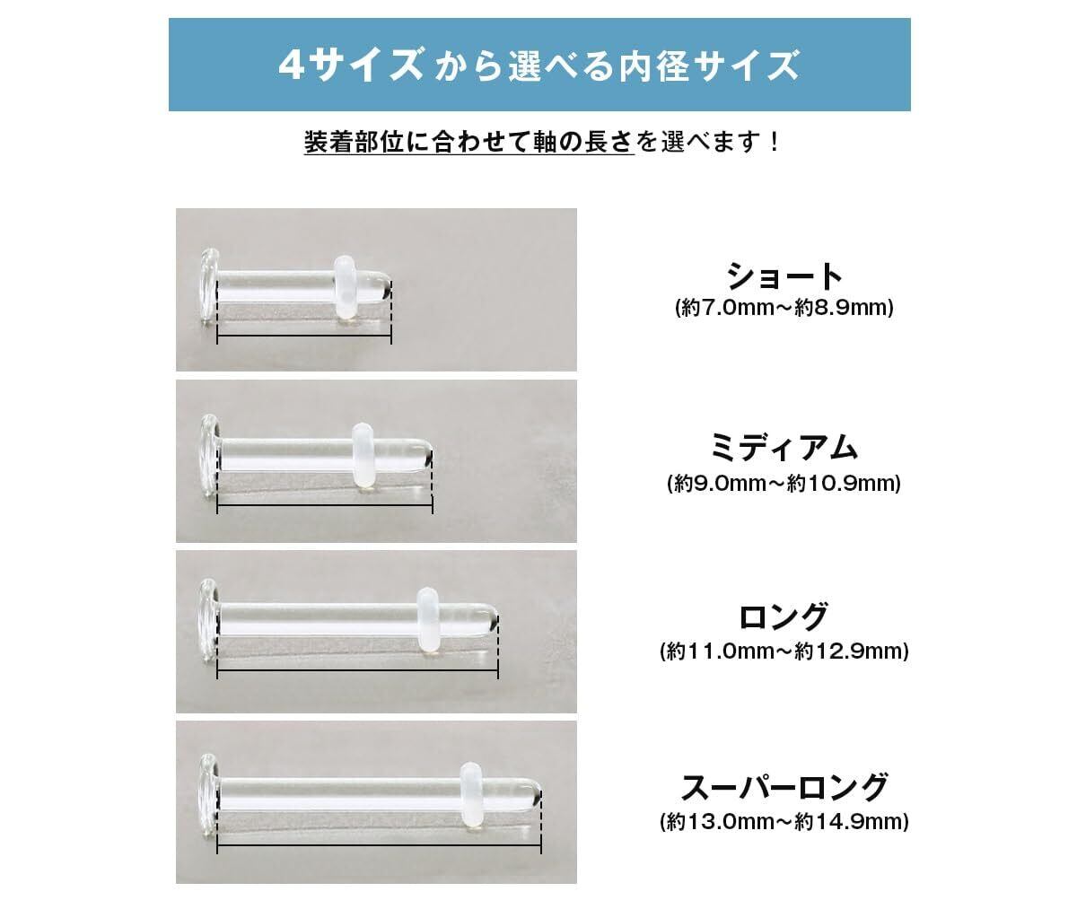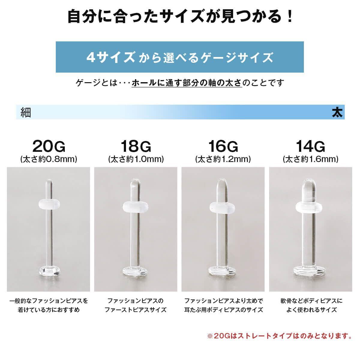 【選べるサイズ】 ゲージ(太さ)サイズ(20G 18G 16G 14G)、ご自分に合った長さを選べます。ショート(7.0mm~8.9mm)・ミディアム(9.0mm~10.9mm)・ロング(11.0mm~12.9mm)・スーパーロング(13.0mm~14.9mm)の4種、お好きなゲージサイズや全長を確認してご購入ください。