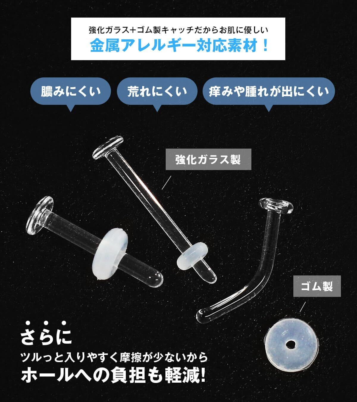 【お肌に優しく衛生的】 シャフトは耐熱強化ガラス素材、キャッチはゴム製なので、お肌に優しい、金属アレルギーの方にも安心!肌荒れしにくくアクリルより頑丈!装着時の摩擦が少なく、ホールへの負担がかかりにくいです。衛生的に使用可能で石鹸または消毒液での簡単なお手入れでずっと清潔!長く使うことができるので、衛生面、コスパ共に◎!ファーストピアスやピアスホールを休める時に比較的自由にお使い頂けます。