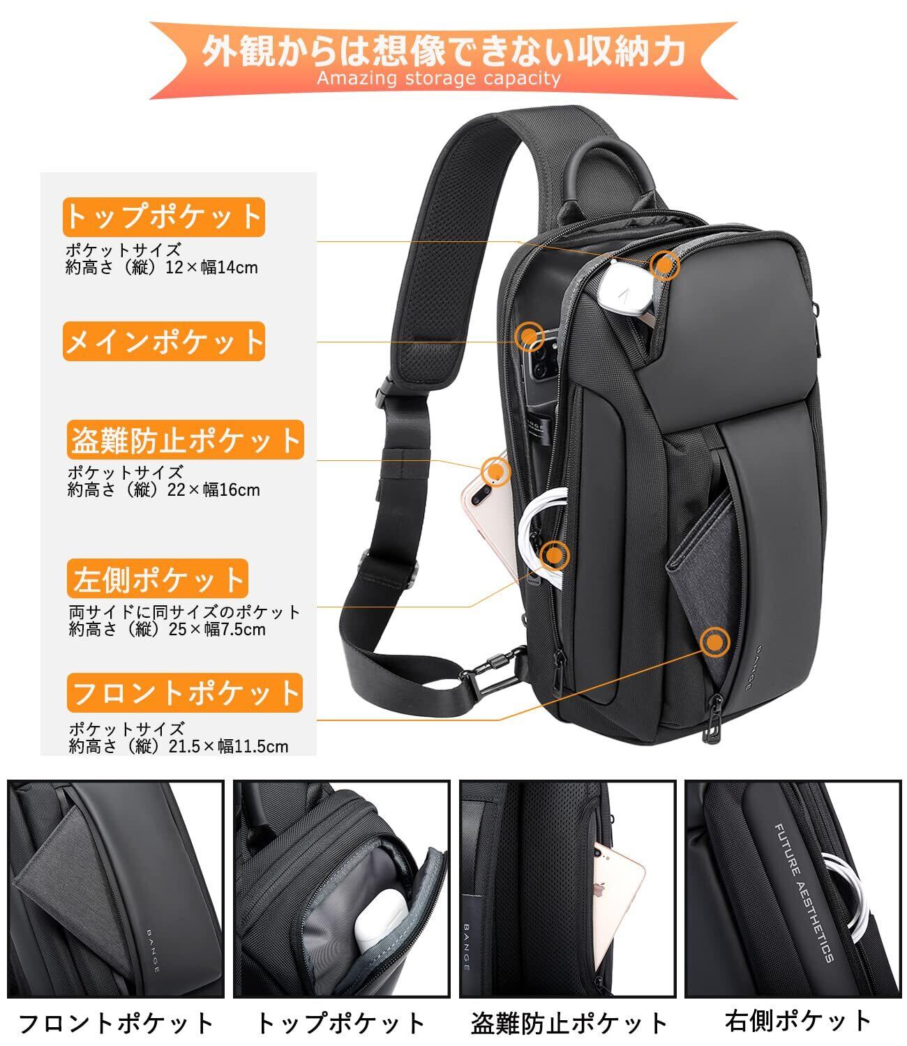 【細部にもこだわりを】品質にこだわったなめらかなYKKファスナー、ストレスなく長くお使いいただけるよう、使用頻度の高いファスナーは耐久性の高いファスナーを使用。機能性、デザイン性だけでなく、品質にもこだわったボディバッグ。背面に隠しファスナーとセキュリティポケットが有り、スマートフォンや定期などの使用頻度の高いアイテムの収納に便利な構造になっております。
