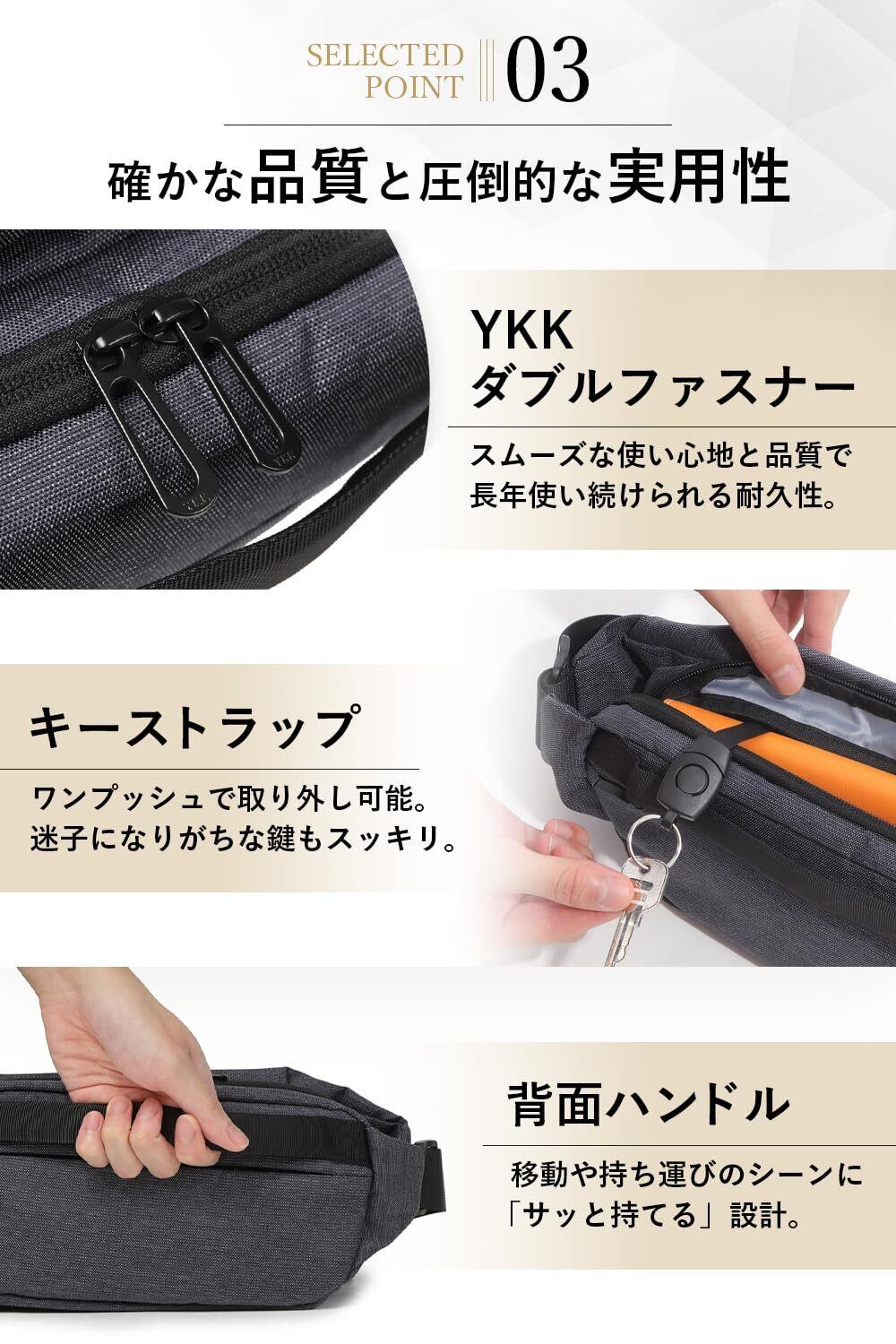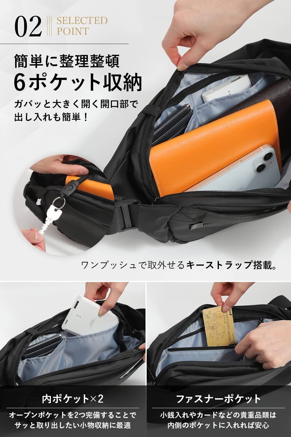 【 特徴2:必要最低限のアイテムがすべて入る 】500mlペットボトル、折り畳み傘が入る横長サイズ。メイン収納には長財布、スマホ、モバイルバッテリー、ワイヤレスイヤホン、鍵 など、ちょっとしたお出かけに必要なアイテムが全て入ります。 内側に大小3つのポケット、背面にもフリーポケットが搭載され 貴重品収納が安心です。着脱式キーストラップ、便利なハンドル付き。