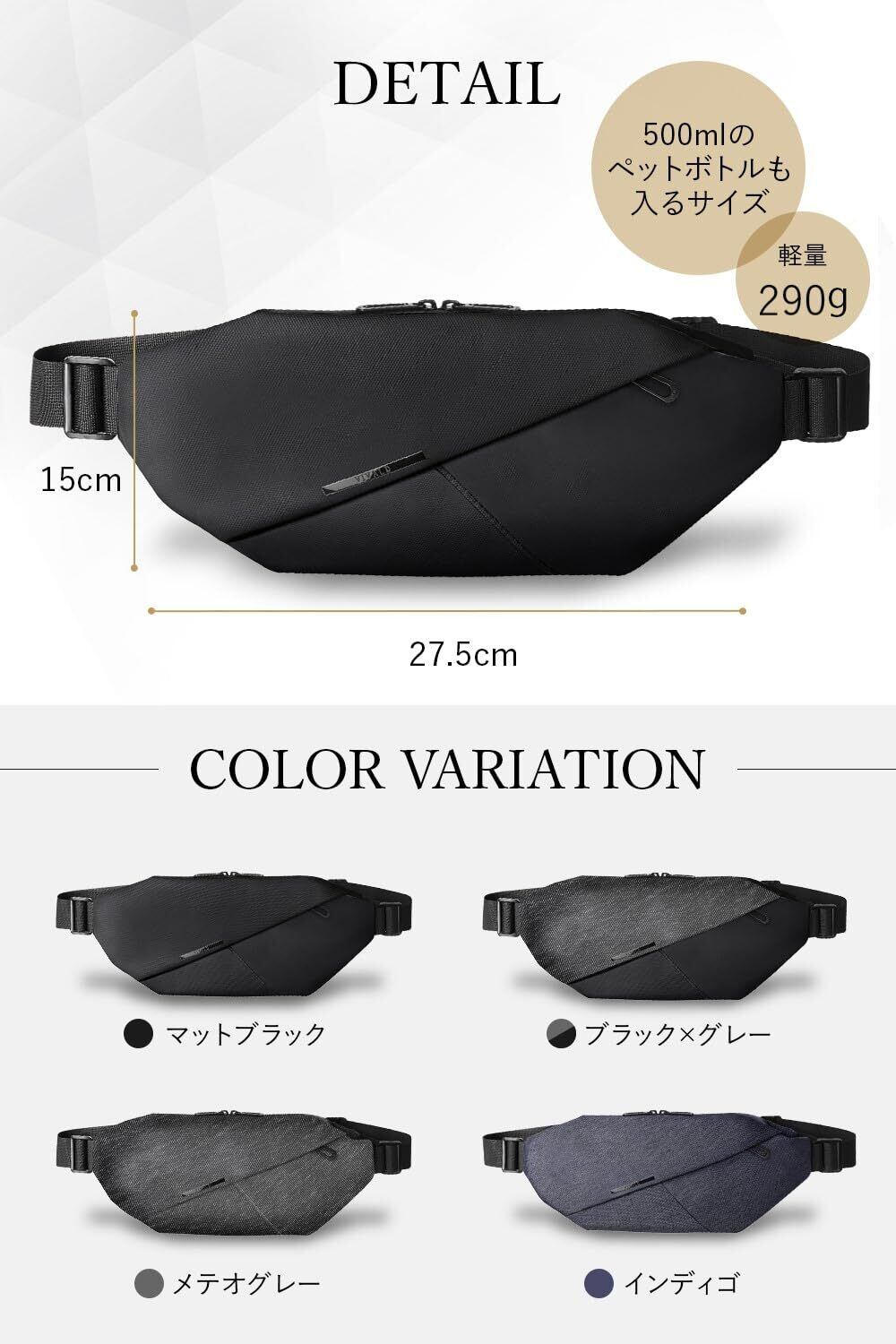 【 特徴4:選べるカラー 】VIVALD ボディバッグ では、お客様のライフスタイルに合った特別なカラーを揃えました。他のアイテムと組合せやすい定番カラーから、ユニセックスで楽しめるバイカラーデザインの2タイプ。学生から 20代 30代 40代 50代と多くの幅広い世代で選ばれています。オリジナル梱包でギフトやプレゼントにも喜ばれています。 ■【Details】:サイズ:38cm×15cm×8cm、重さ:290g、ベルト長さ:60cm-最大100cm