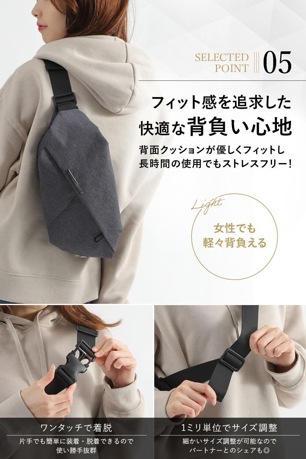 【特徴3:他と違う 独自のフィット構造で負担を軽減 】バッグ全体をバランスよく「面で支える」ガセット構造デザイン。荷物が少ない時は薄く、多い時は拡張し、常に最適な厚みであなたの背中にフィットします。また、お客様の共通課題である、歩行中のベルトゆるみ・ズレ防止には、ダブルアジャスター機能を搭載することで解決。背面側に、クッション材を内包し 荷物の凸凹感も解消され、より快適な背負い心地が得られます。