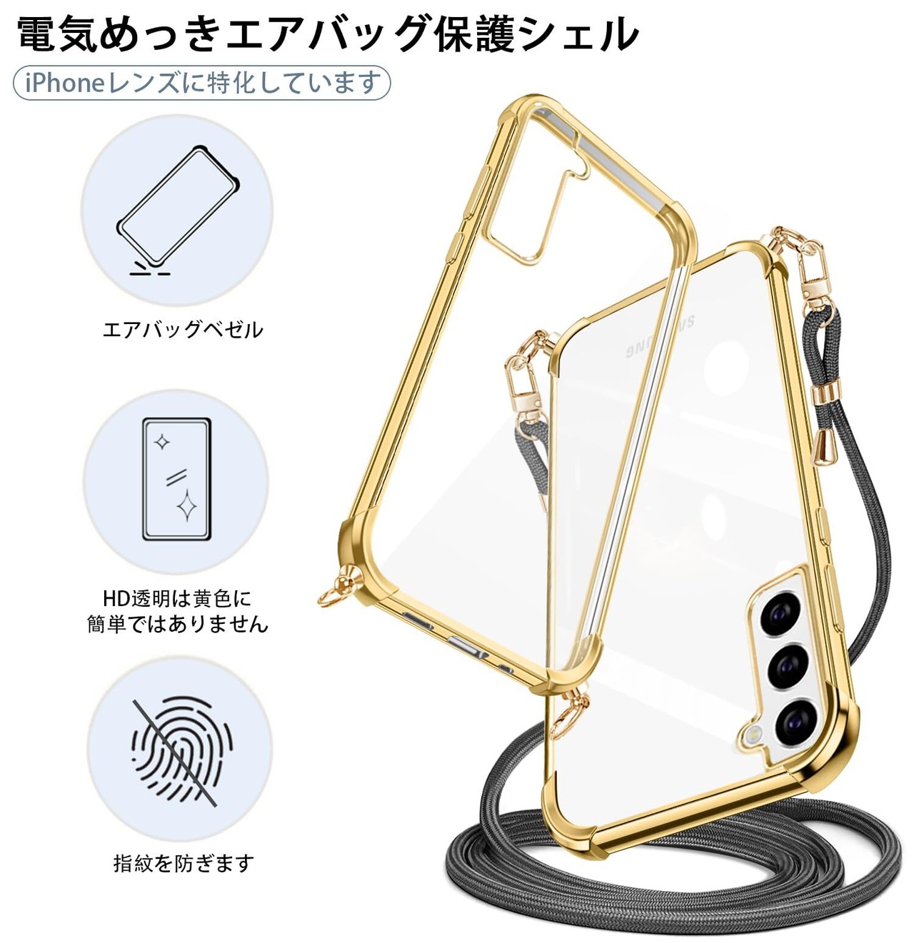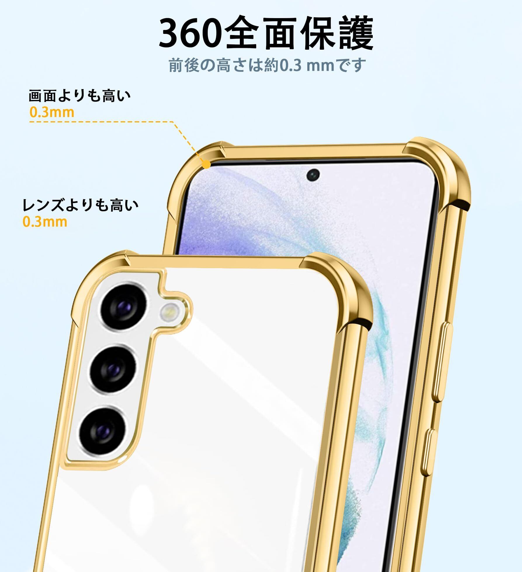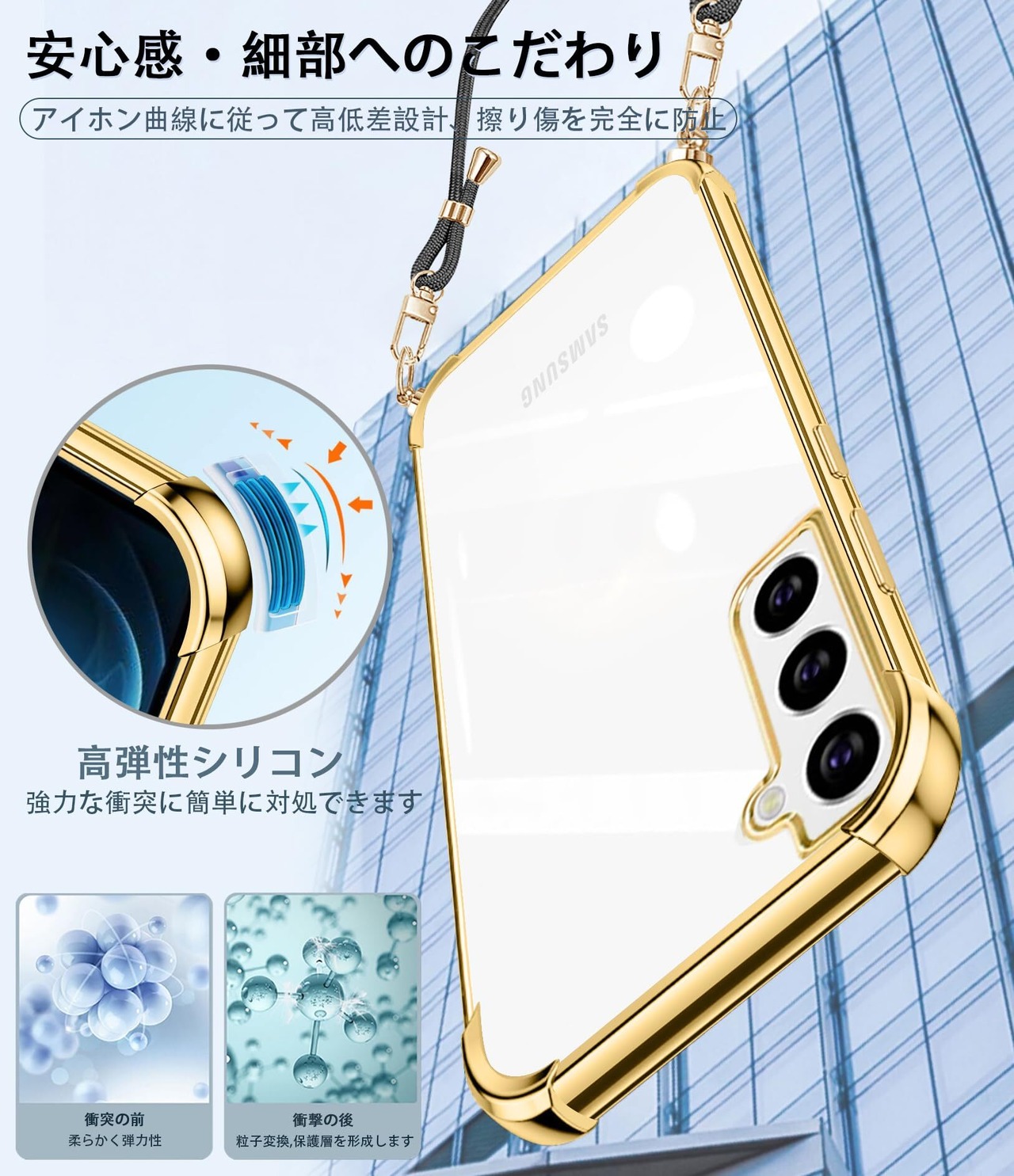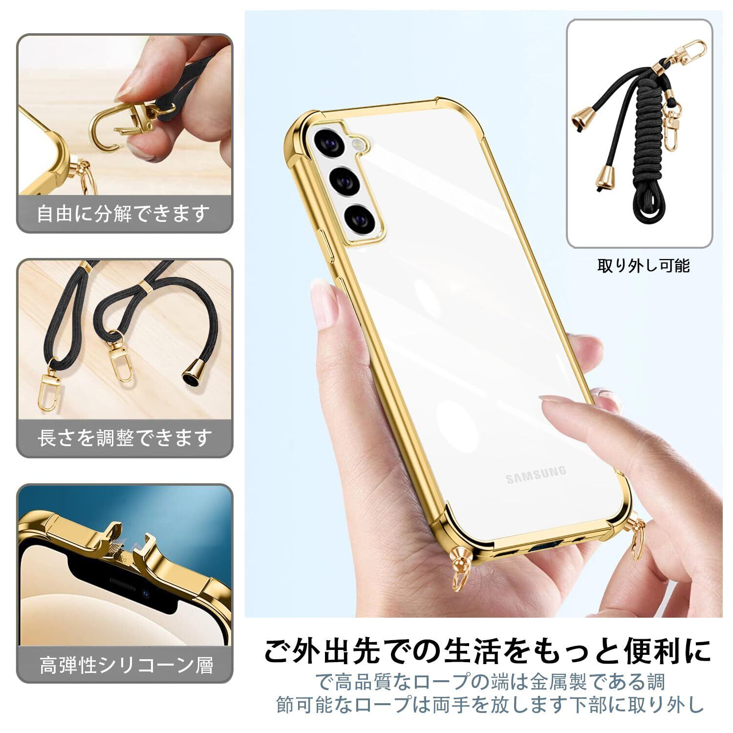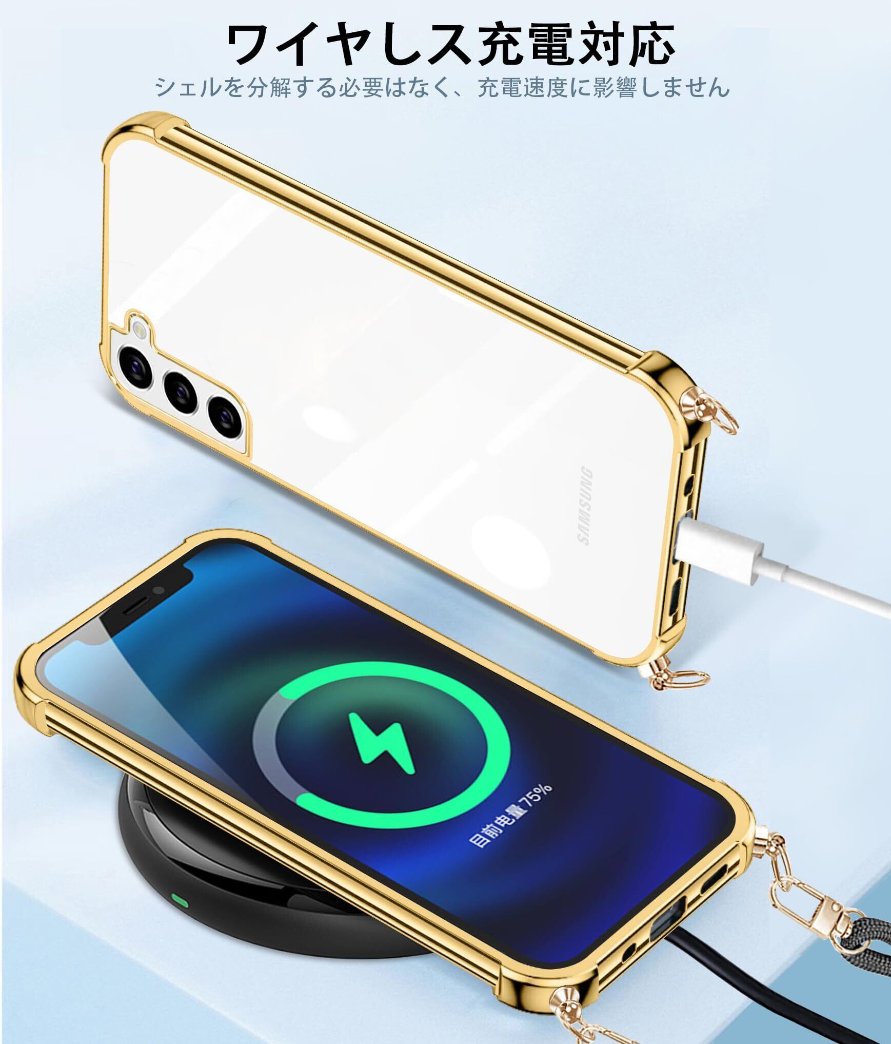 weiaoluo Samsung Galaxy S21 ケース クリア ショルダー 耐衝撃 galaxy SC-51B SCG09 マホケース ギャラクシーS21 カバー 薄型 galaxyS21 対応ケース TPU 軽量 肩がけ 首掛け 紐付きバンパー カバー ストラップ付き ストラップホール付き 透明 着脱可 調節 Qi充電 ワイヤレス充電 傷防止 (ゴールド)