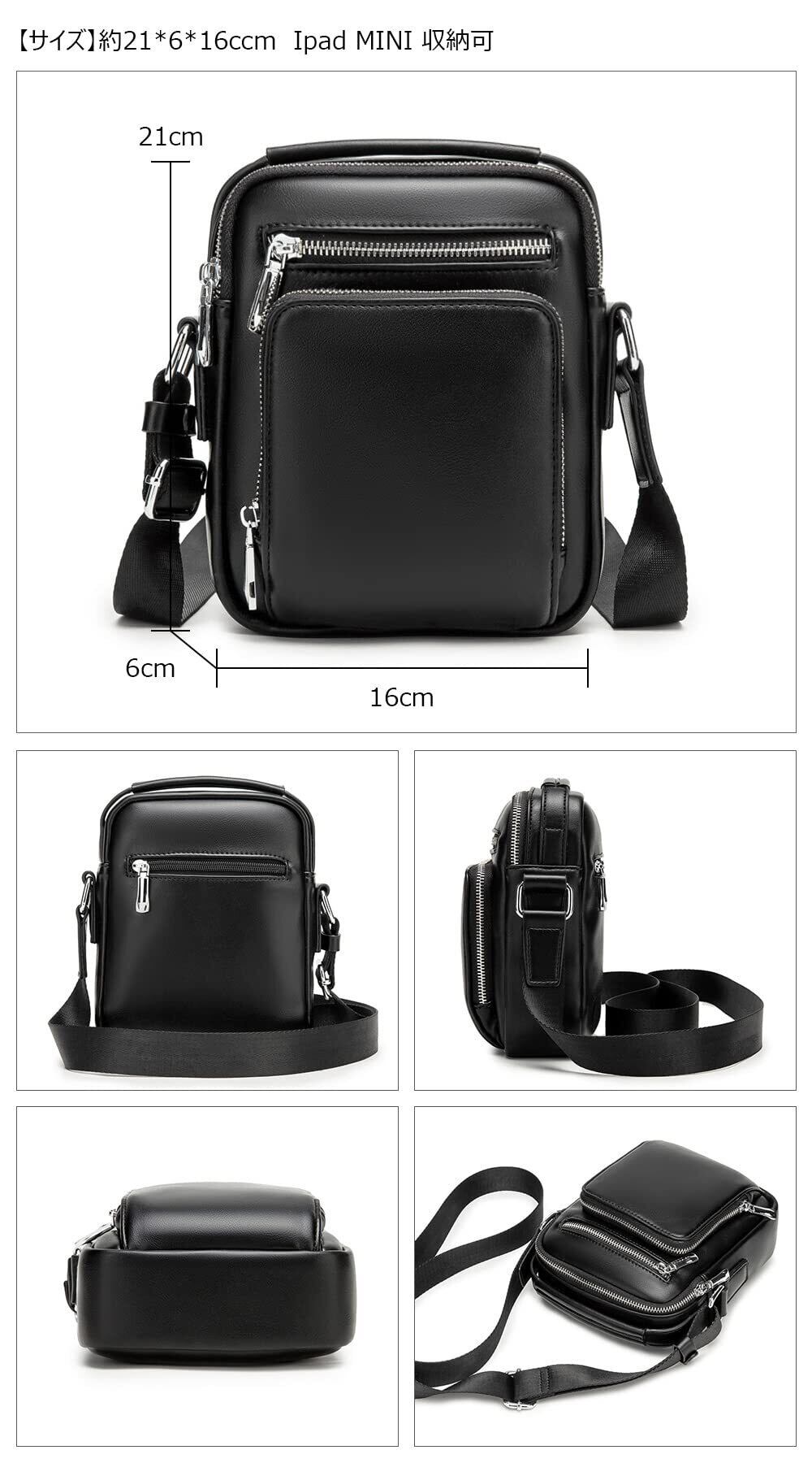 4、【仕様】重さ約0.5KG 、サイズ約21*6*16cm IpadMINI収納可、収納仕様:メインポケットx2、ファスナーポケット×1、フリーポケット×1 正ファスナーポケット×1 背ファスナーポケット×1
