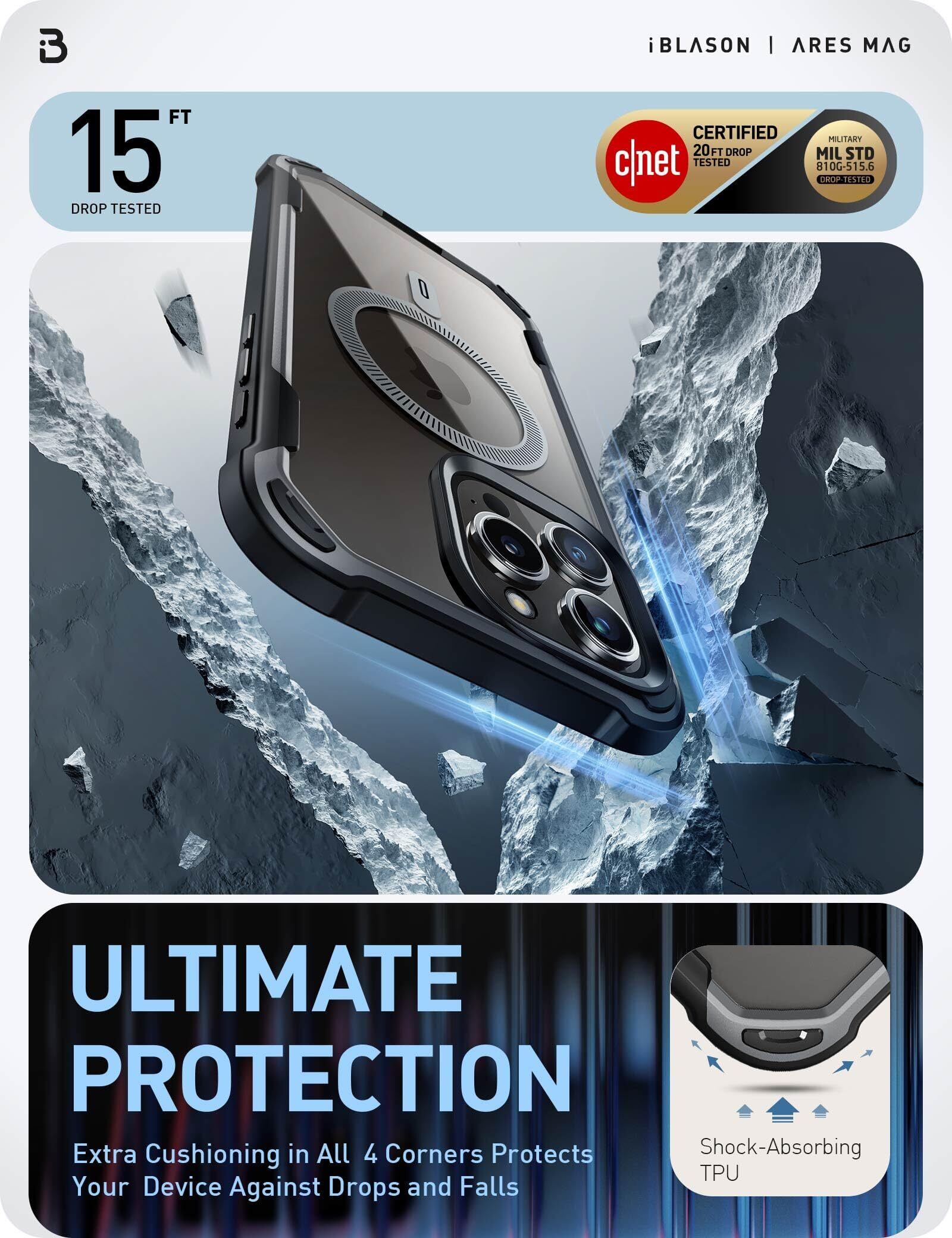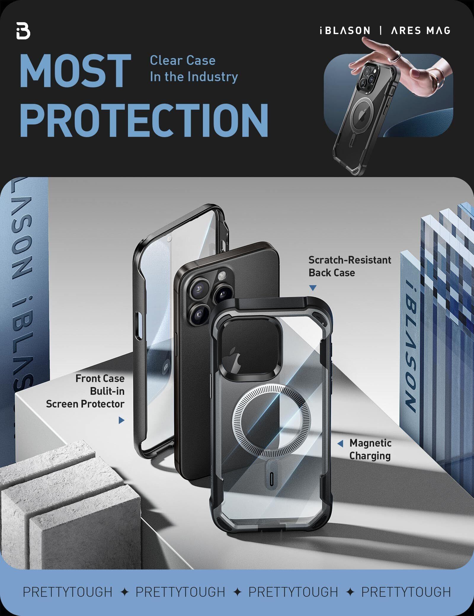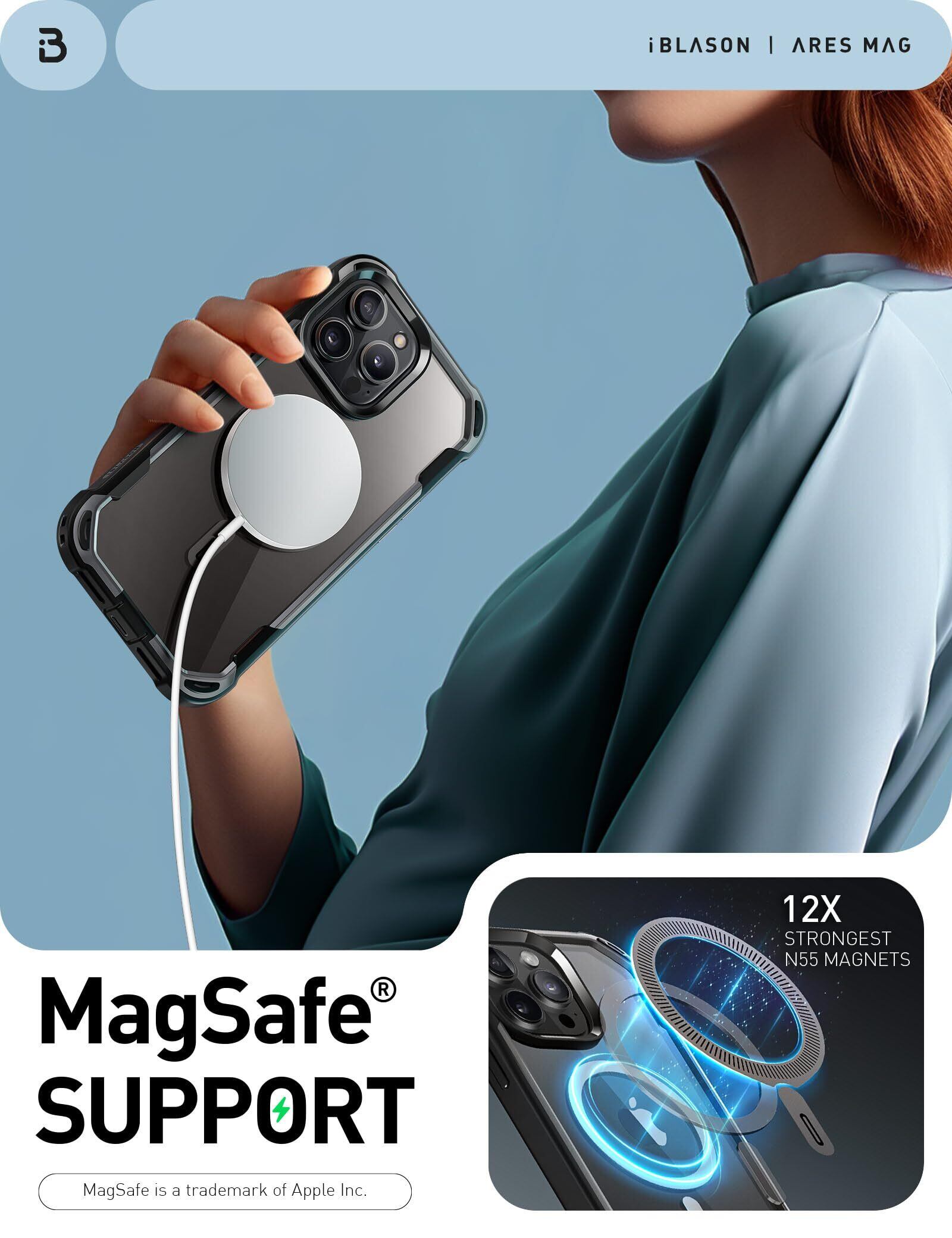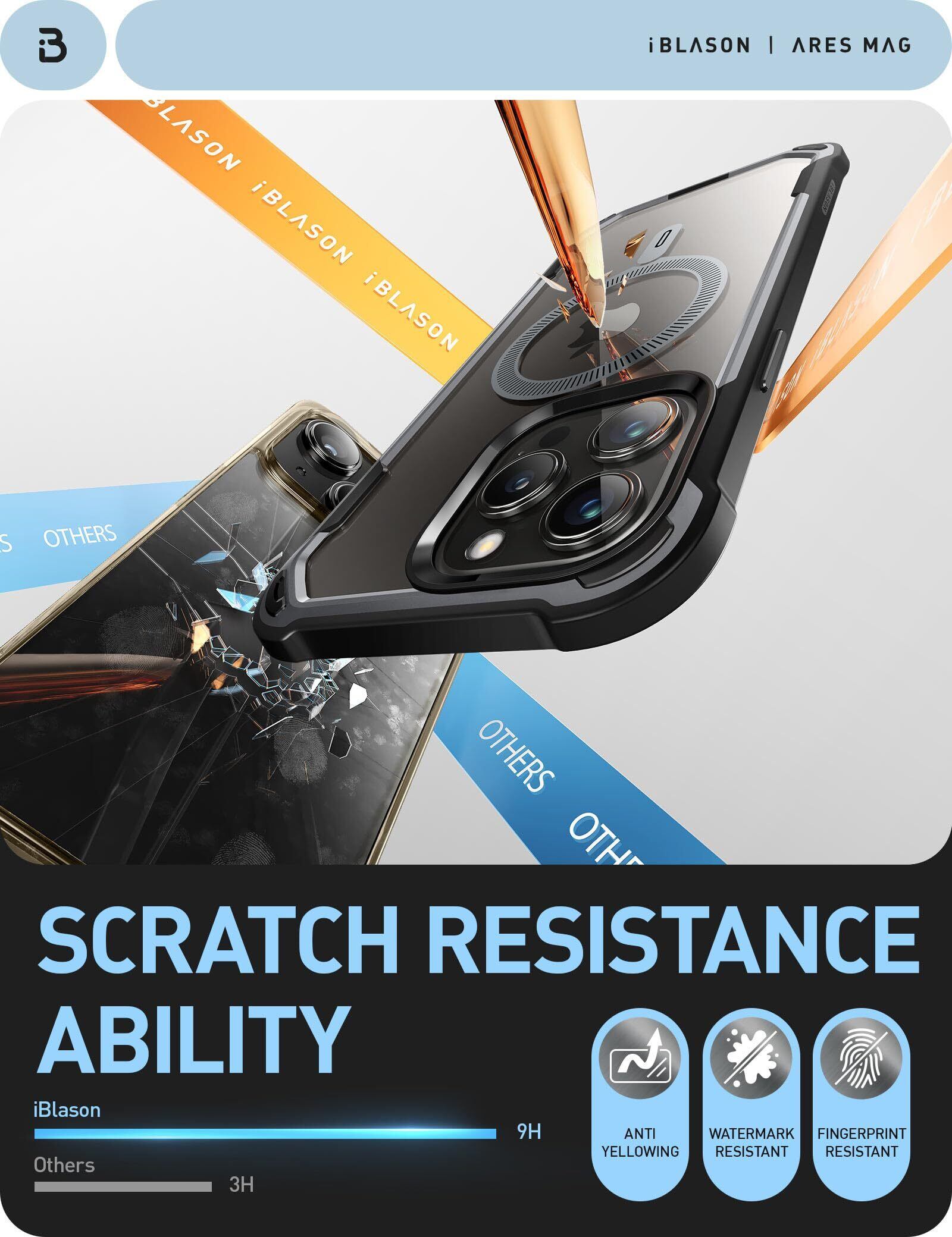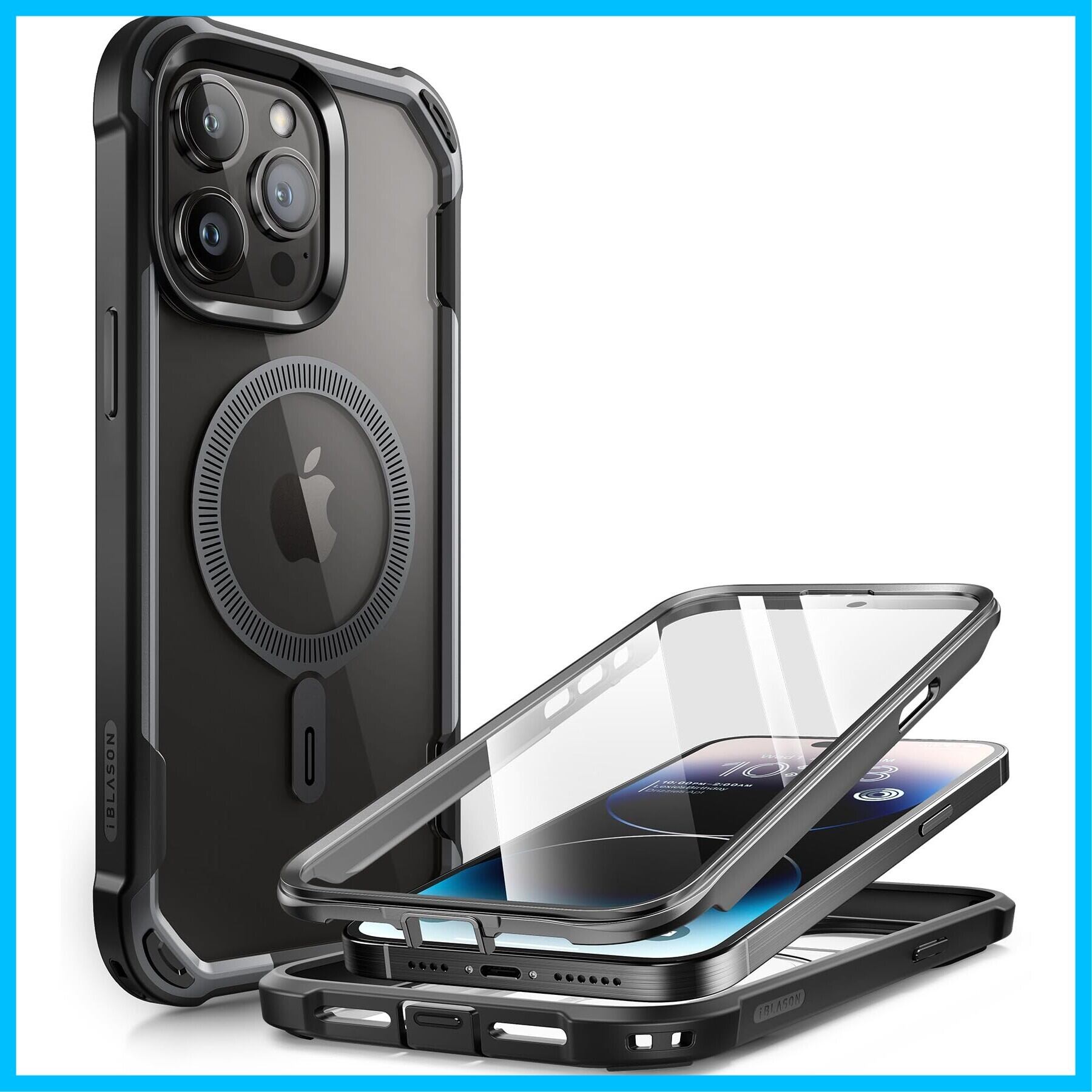 i-BLASON iPhone 15 Pro max 用 ケース マグネット搭載 背面透明 磁気ケース 2023 液晶保護フィルム付き 全面保護 MagSafe対応 米国軍事規格取得 360°保護 耐衝撃 防塵 衝撃吸収 耐久性 密着 ケーブル充電可能 背面クリア カバー AresMagシリーズ