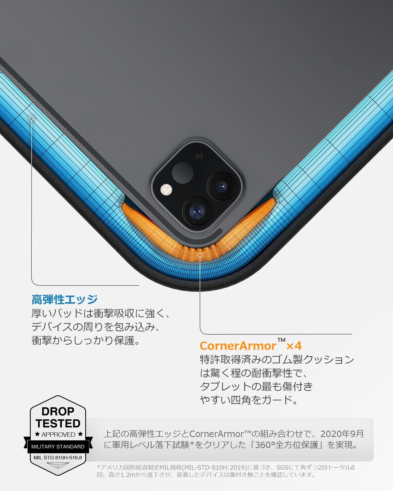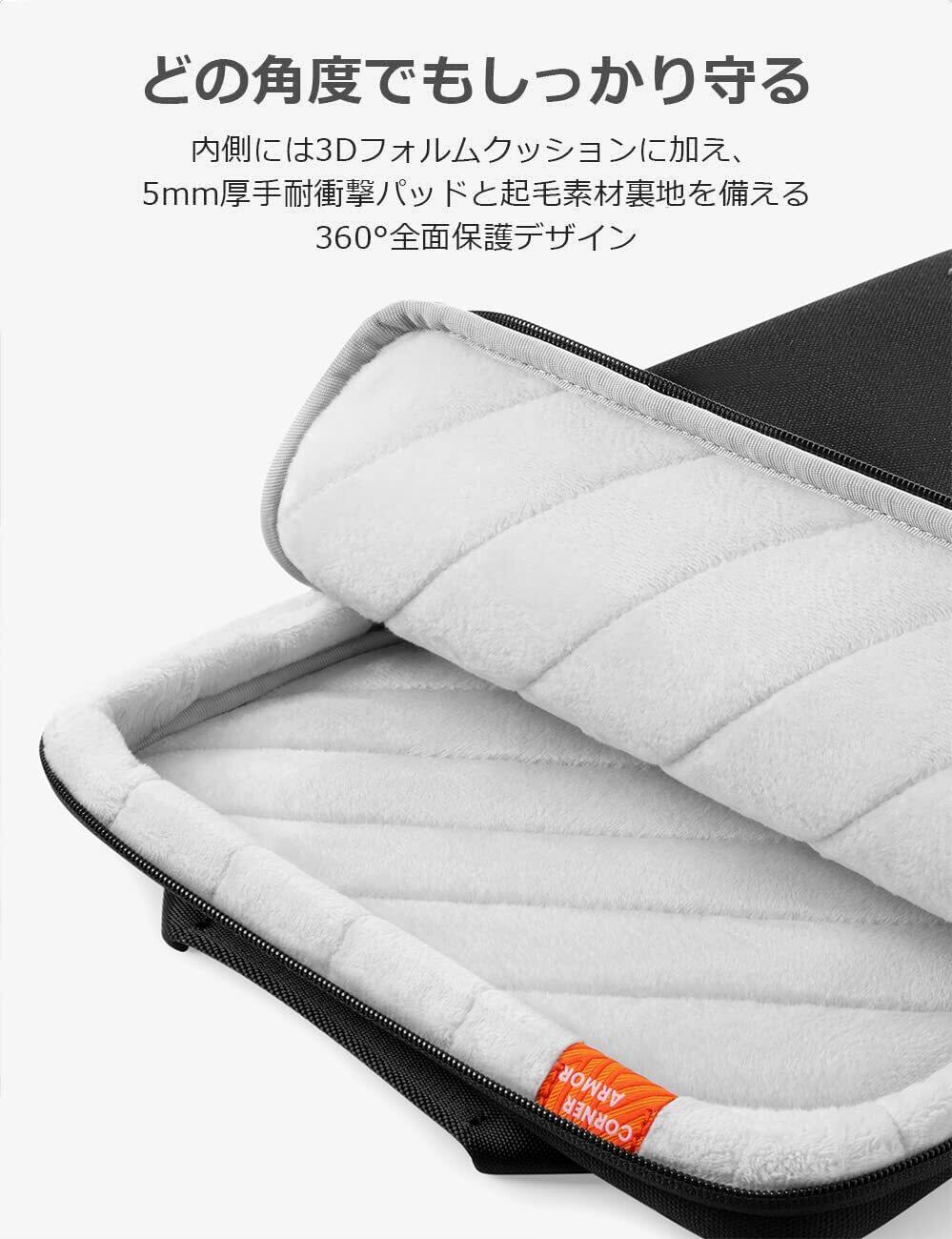 【360° 全面保護】特許取得の独創的な「CornerArmor 」ガードはケースの4角にあり、エアバッグのようにタブレットを落下、衝撃などのダメージから守ります。内側の厚みのあるふわふわとしたクッションは衝撃吸収に優れて、擦り傷防止に役立ち、中身を柔らかく保護します。フロントポケットもクッション性のある裏地採用。