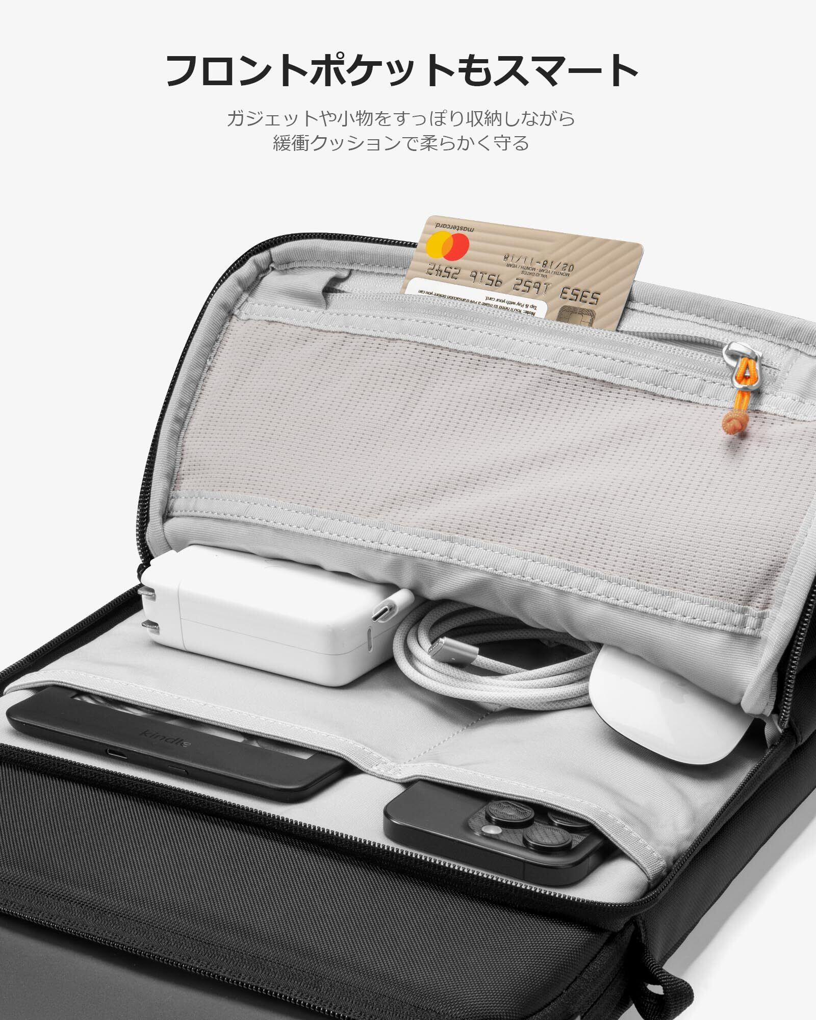 【大容量でスマート収納】スマートデザインのフロントポケットは多様な仕切りが備わり、タブレット端末、周辺小物などをスッキリ・一気に整理・収納できます。その中にジッパー型メッシュポケットは重要なビジネスアイテムの収納に最適。