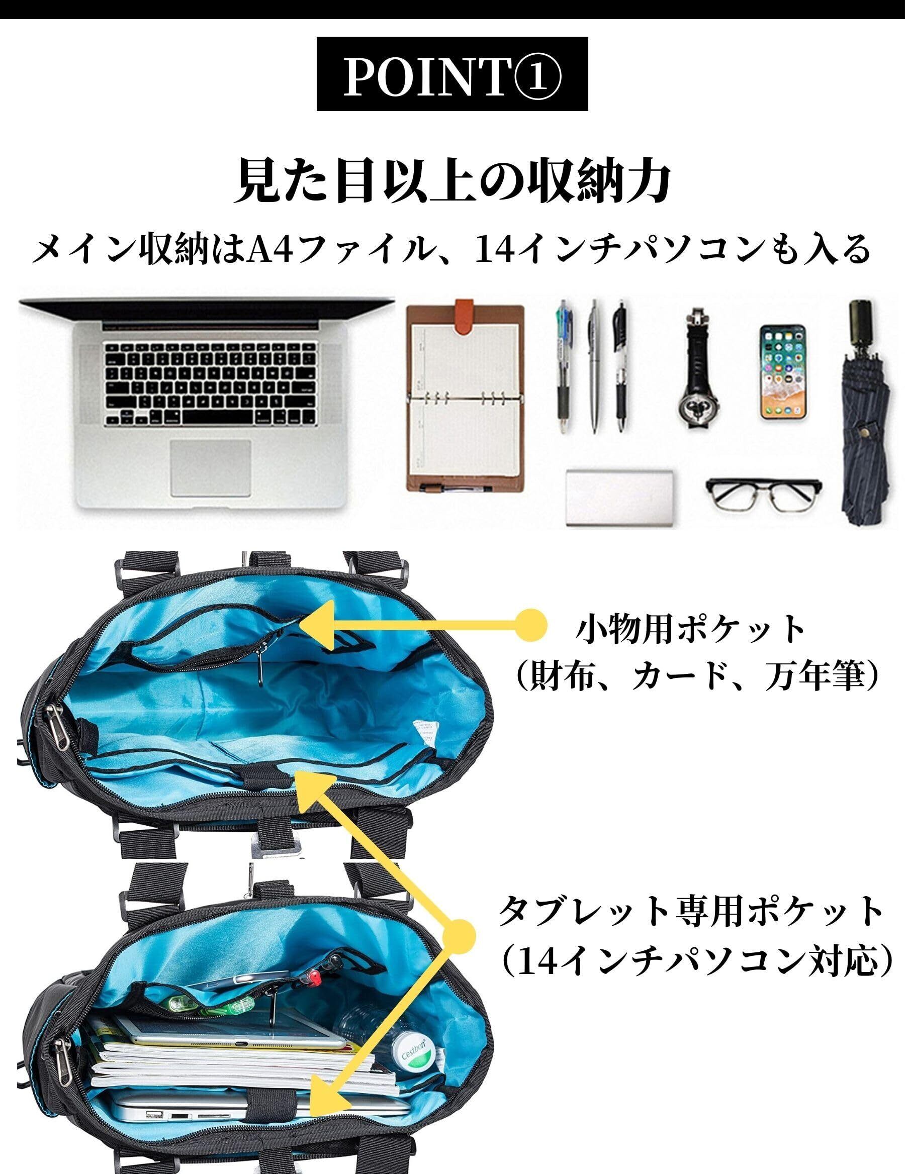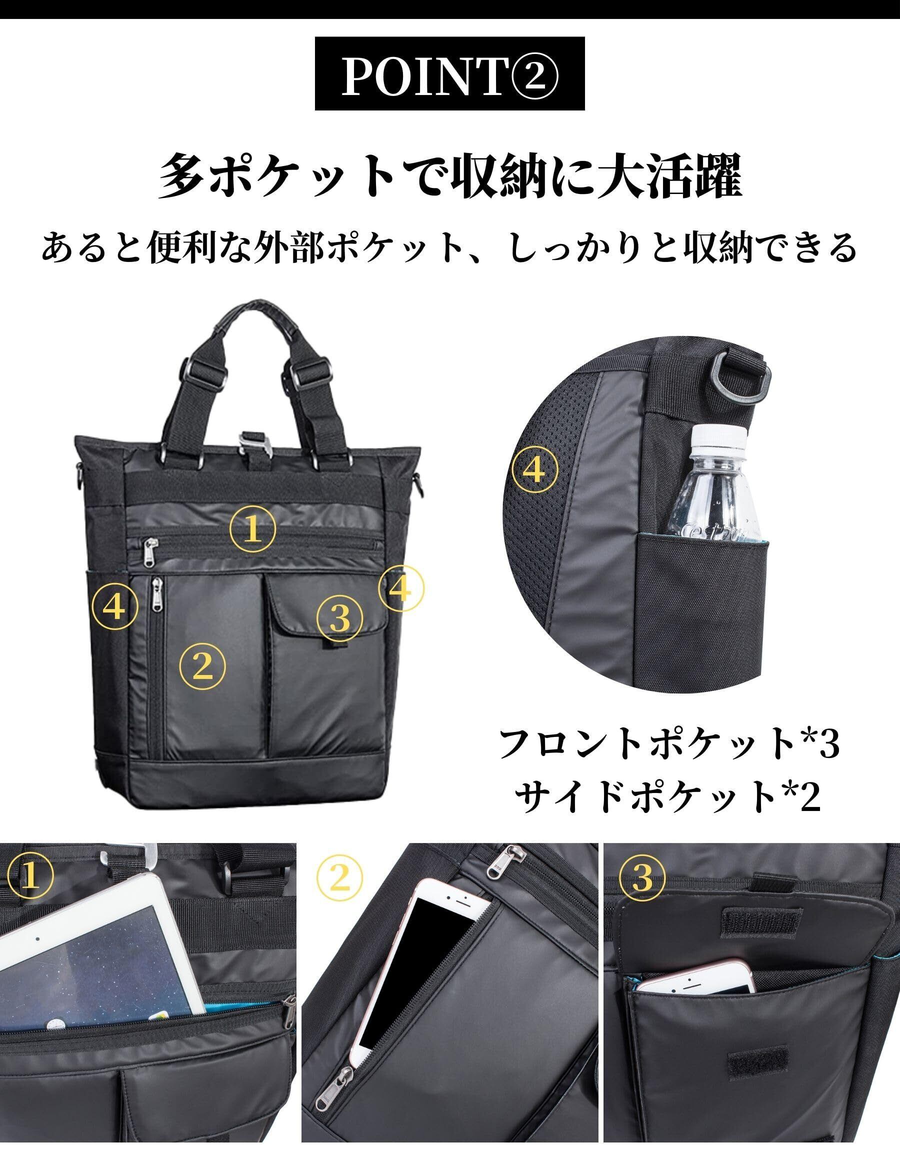 【容量】メイン収納は、a4ファイル、14インチパソコンも入る大容量タイプです。通勤通学、アウトドア、旅行に喜ぶ使える便利なバッグ。【多機能】スタイリッシュでデザイン性の高いトートバッグです。トートの他、斜めがけでショルダーバッグ、手提げ袋、リュックスタイルにもなる4WAYタイプ多機能のカバンです。
