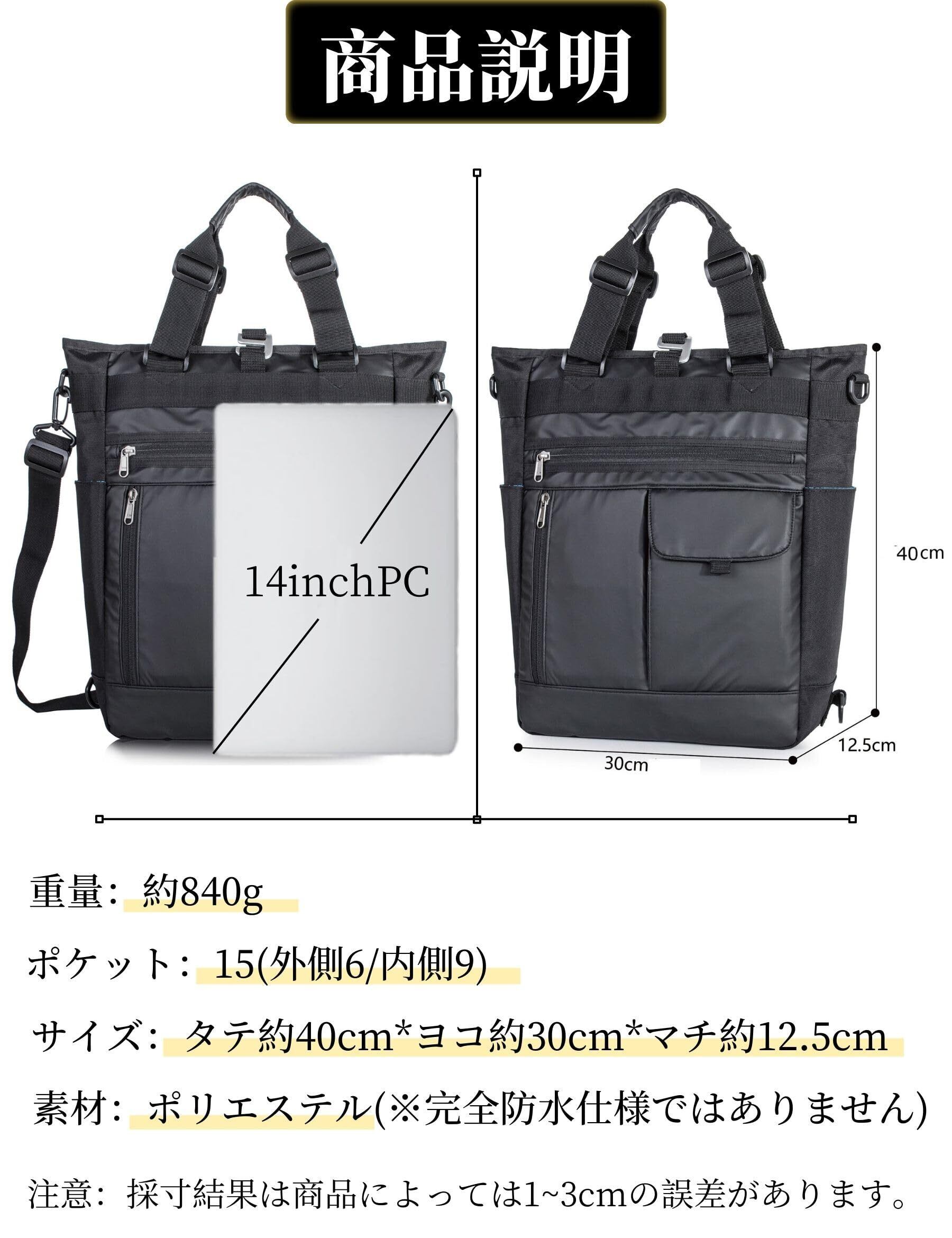 【寸法】タテ約40CM*ヨコ約30CM*マチ約12.5CM メイン収納は、a4ファイル、14インチパソコンも入る大容量多機能メンズトートバッグです。ポケットの数:15(外側6/内側9)