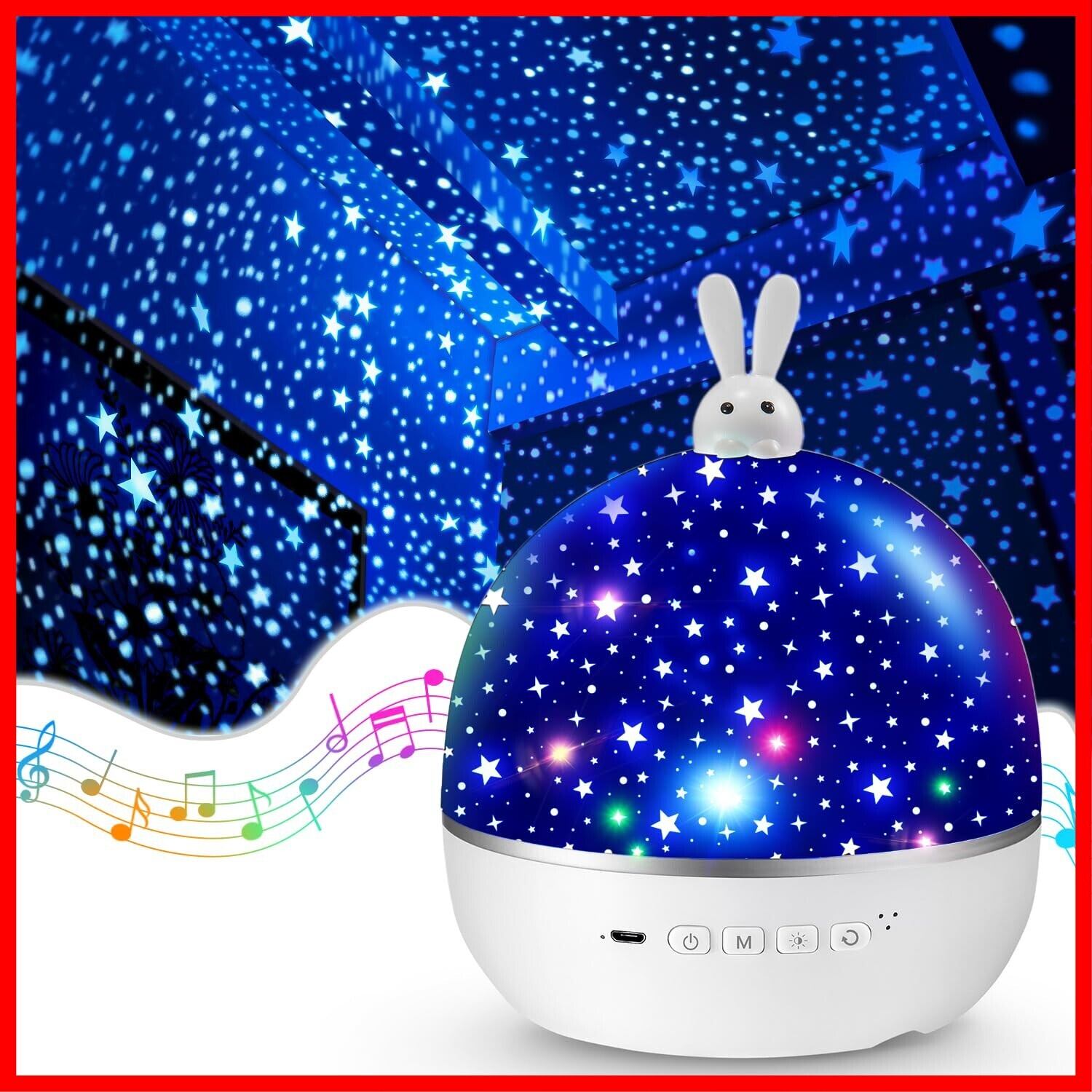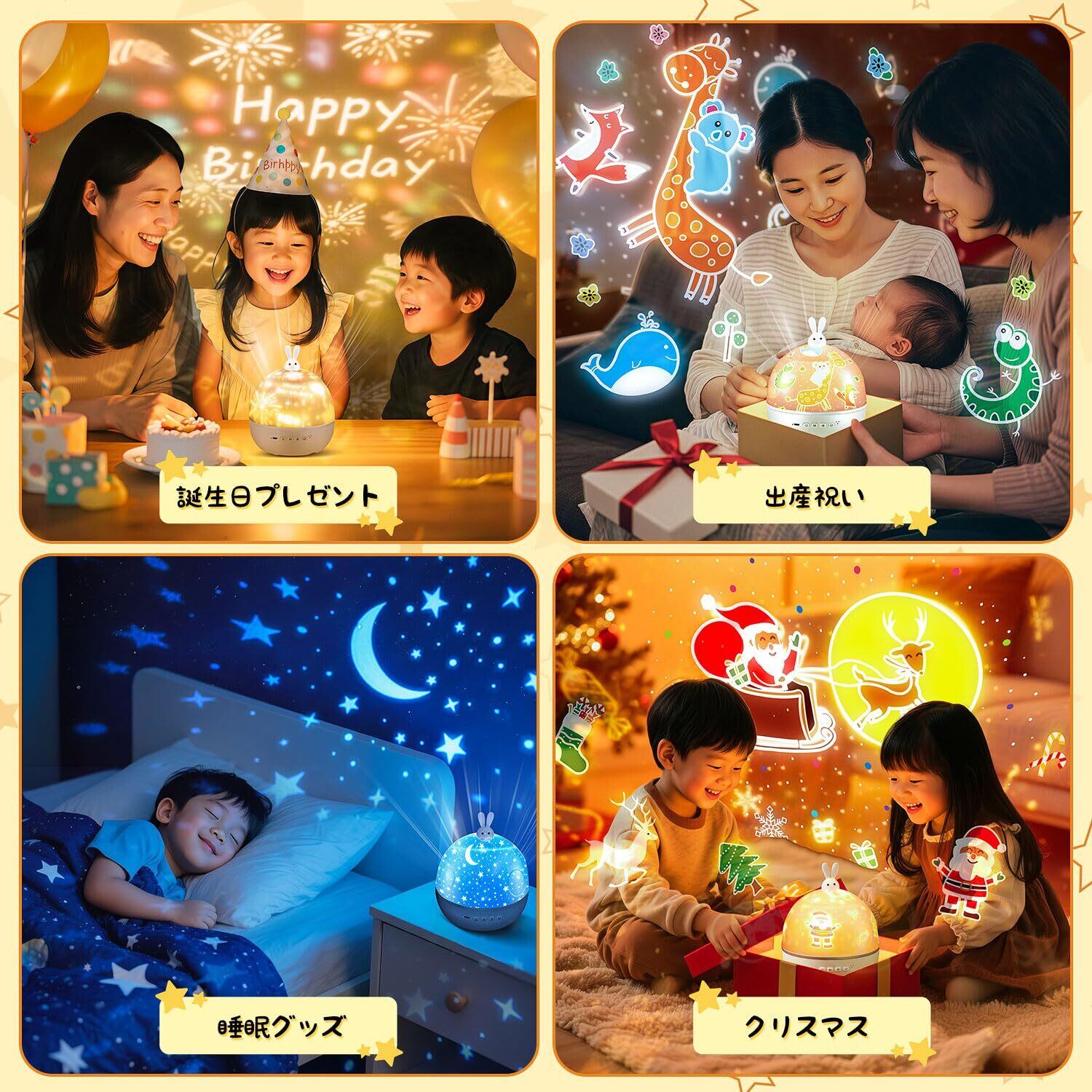 【22種類投影フィルム】最新版家庭用プラネタリウムライトは投影できる絵柄を変えられるフィルムが22種類もあるので、飽きずに利用できそうです。さらに兎の見た目もかわいく、子供でも大人でも大変気に入っております。毎日フィルムを変えて、お部屋中が夢の世界に変わり、誕生日飾り付け、クリスマス飾り、ハロウィン飾り、出産祝い、結婚祝い、新築祝いなどのイベントにも使えます。子供でも大人でも童心に帰れるような楽しみ方ができる。夜寝る時に真っ暗にして使えば天井にだいぶはっきりと綺麗でうつります。家庭用プラネタリウムのフィルムは可愛くて、シーズンのものだけでなく、男の子女の子どちらも楽しめる絵なので汎用性があります。子供ももちろんですが、大人が癒されるインテリア雑貨です。