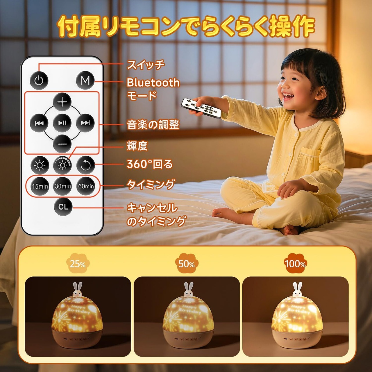 ⏰【タイマー設定・USB充電式】おしゃれな間接照明はリモコンで簡単に制御できます。タイマー設定が15分、30分、60分があり、寝かしつけの時にも自動で電源が切れて便利です。もし寝てしまっても安心です。寝る前に、タイマーをセットすれば消費電力少なく省エネな寝かしつけベッドサイドランプになります。充電式で場所を選ばないし、サイズも小さくて邪魔にならなくて、収納にも困りません。明るさも3段階的に調節することが出来るのでシーンに合わせて変えることができます。就寝時、部屋全体にかわいい絵が投影されて、色も変えられます。ledライトは暖光、白光、青光、混色の照明モードがあります。ライトをつけるだけでロマンチックなお部屋になりとてもステキです!
