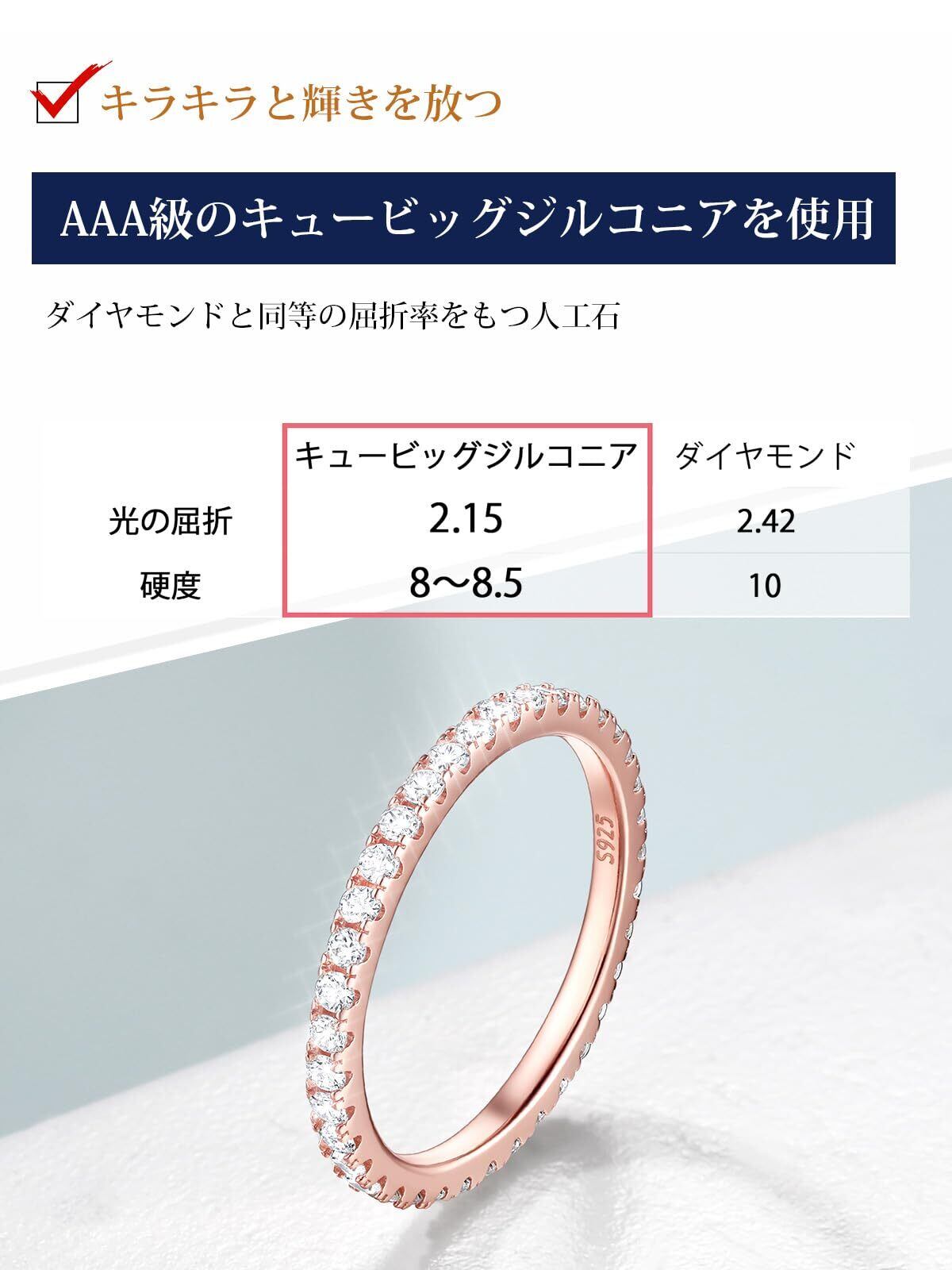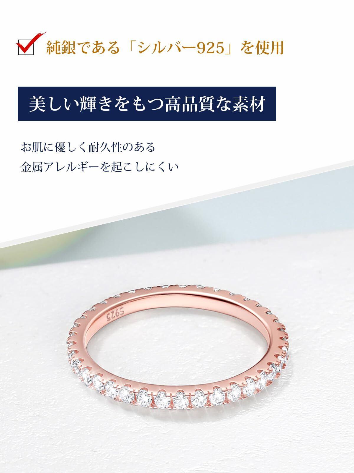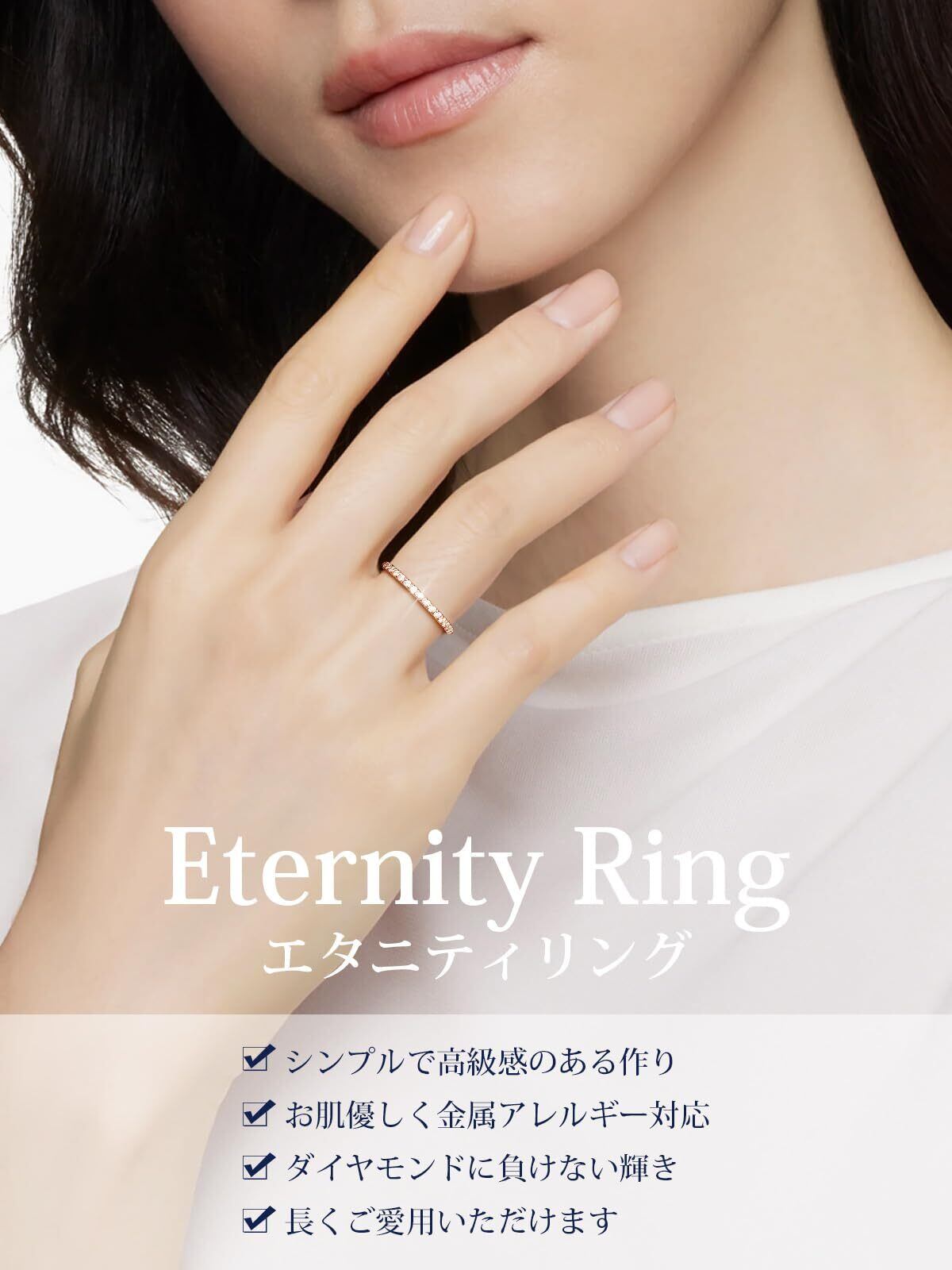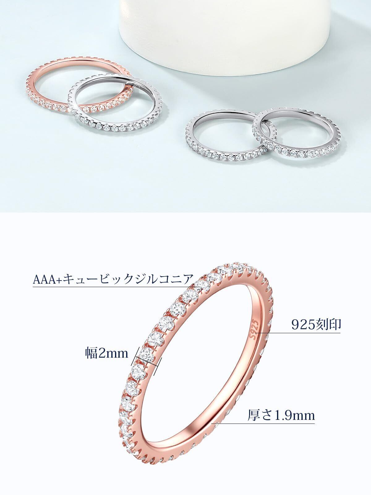 [カラーは2種類] エタニティリングの幅は約2mmです。カラーは清楚で上品なイメージのプラチナ仕上げと、日本人の肌に馴染みやすいピンクゴールド仕上げの2色展開です。