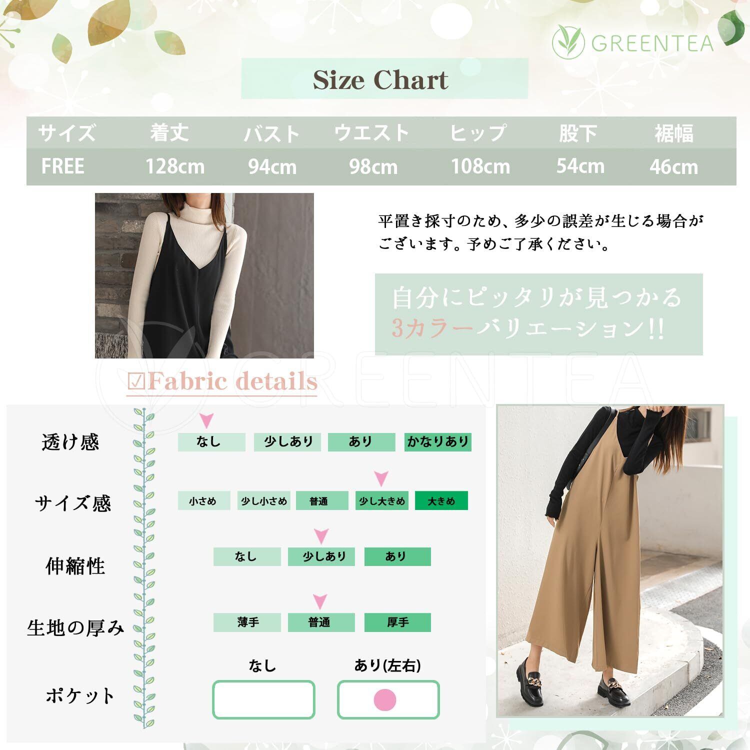 ※平置き測定(cm)となりますので、多少の誤差がございます。また、モニター環境により、実物の色合と若干違う場合がございます。ご了承ください。 フリーサイズ :着丈/128 バスト/94 ウエスト/98 ヒップ/108 股下/54 裾幅/46