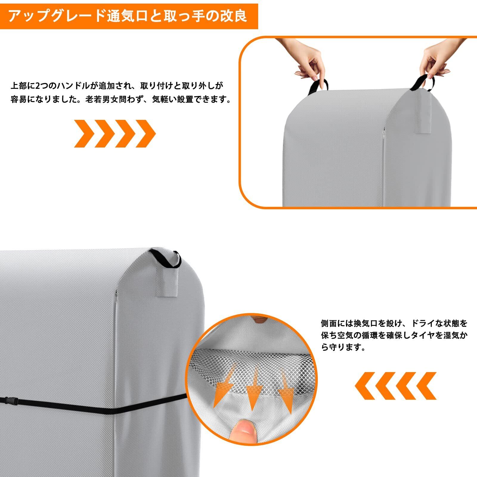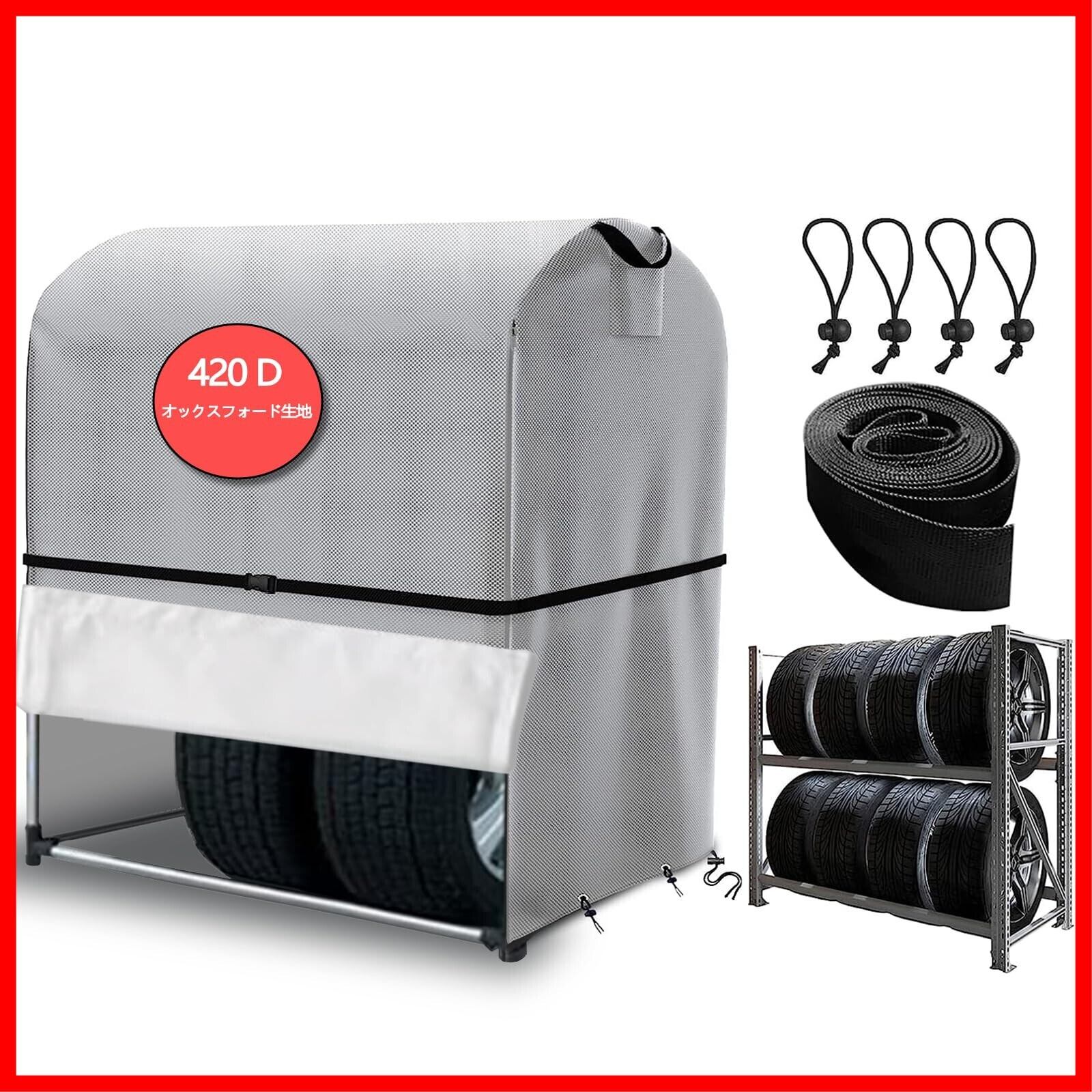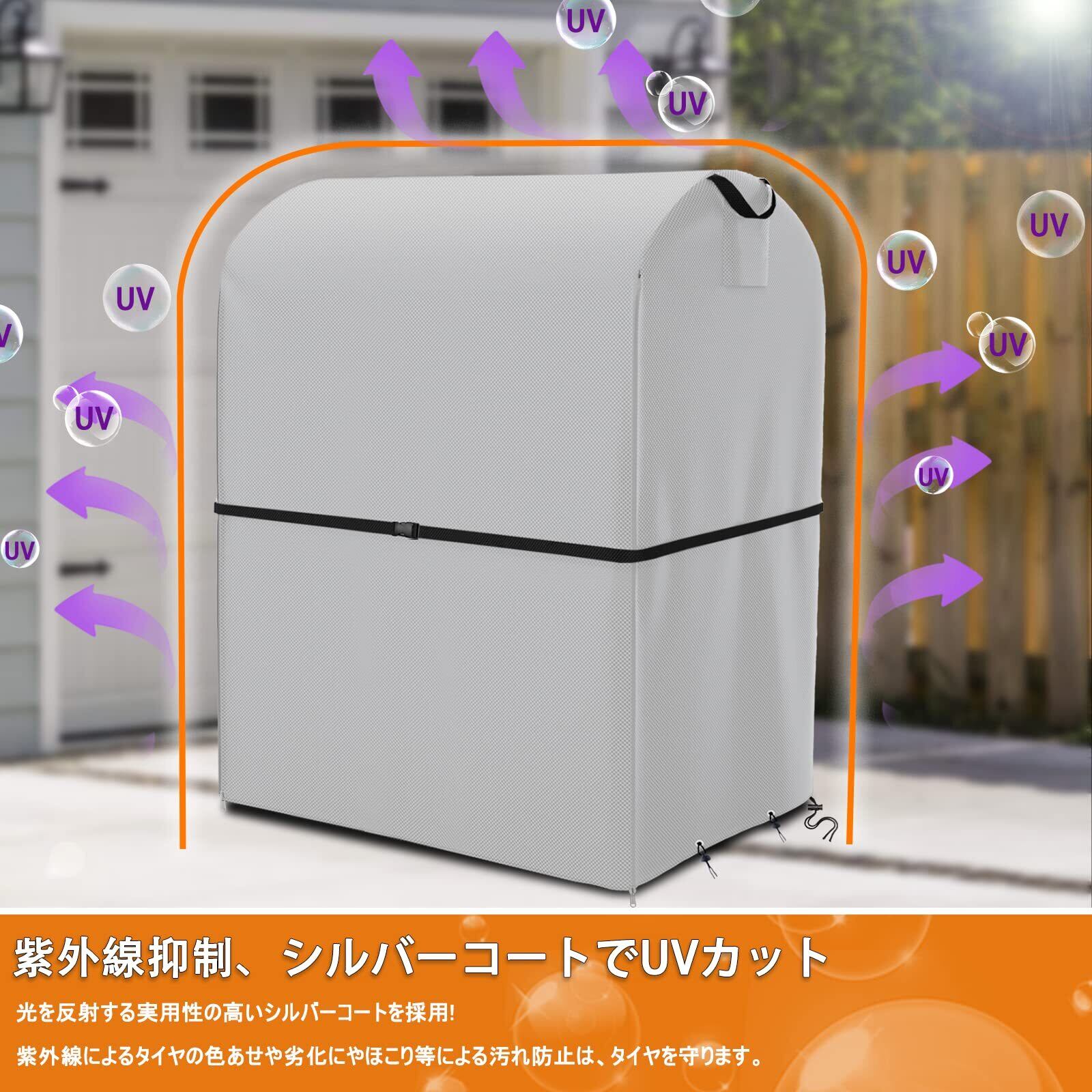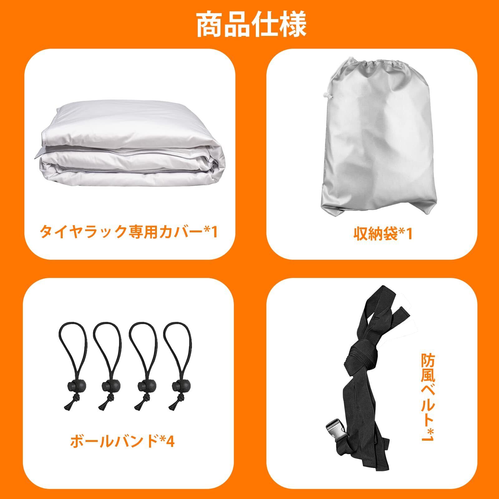 【商品仕様・品質保証】 屋外タイヤカバーのサイズ110×幅75×高さ145cm、タイヤを4本保管でき、適した車種はSUV車である。商品内容(タイヤラック専用カバー:1枚、収納袋:1枚、ボールベルト:4個、防風ロープ:1本)また、収納袋が付いているので、使わない時でも簡単に収納できるのでコンパクトで持ち運びに便利でスペースもとりません。※ここではタイヤラックカバーしか売っていません。タイヤホルダー本体は付属していません。あらかじめご了承ください。商品の購入日から12ヶ月間の品質保証がありますので、ご安心ください!商品の破損などの問題があれば、速やかに弊社にご連絡してください。タイヤ保管カバー使用中に何か問題が発生した場合、たとえ製品を開封していても、本製品の交換、返品、返金に応じます。24時間対応のカスタマーサービス、お気軽にお問い合わせください。