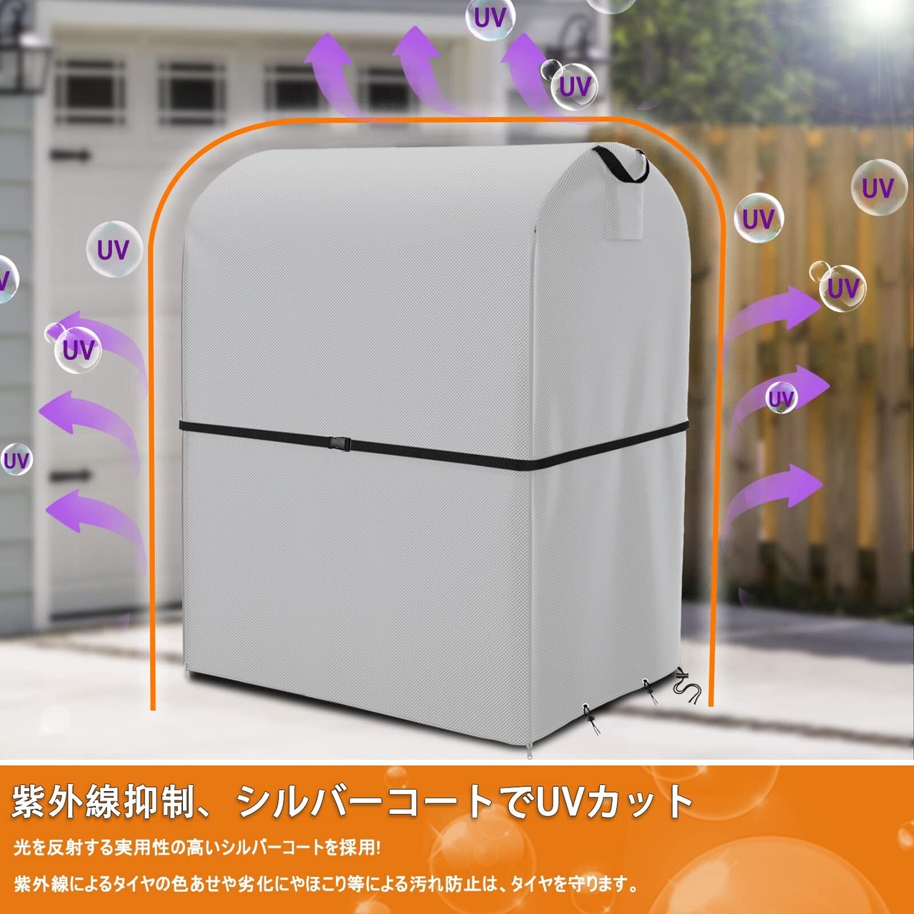 【防水、紫外線防止機能】 こちらのタイヤカバーの生地に撥水加工を施すことで、雨の侵入を防ぐことができます。雨水にさらされた錆からタイヤを保護します。こちらのカバーの裏面にも保護塗料のシルバーコーティングを塗り、高温や日焼け止め、紫外線などからタイヤをしっかり保護保管することができます。室内でも屋外でもタイヤを効果的に保護します!