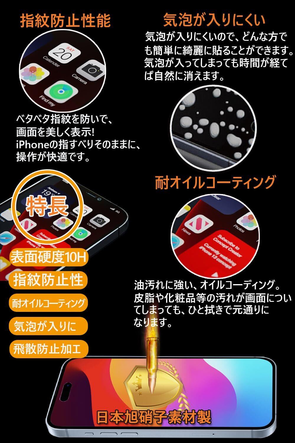 【快適なタッチ感!指紋防止·撥水撥油技術】真空蒸着技術を利用し、表面にナノコーティングを採用し、指紋防止薄膜を形成することで、滑らかであると同時にパワフルな耐油汚れ・汗染み・指紋性能を備え、汚れ防止効果はより長く持続でき、頻繁にスマホを拭く悩みがなくなります。
