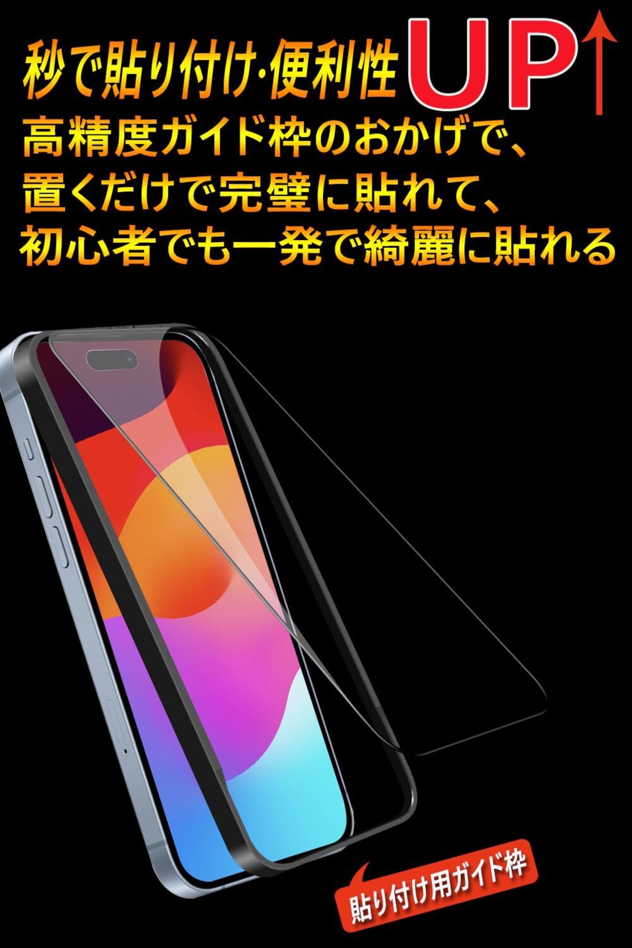 【置くだけで装着!ガイド枠付き・保護ケースと干渉なし】専用の貼り付けガイド枠が同梱されています。ガイド枠を利用することで、初心者でも簡単に貼り付けます。また、自己吸着できるシリコン粘着シートで、簡単的に貼り付けます。ガラスを液晶に置くだけで自然に吸着、簡単に気泡が抜いて行くので、誰でも簡単、綺麗に貼ることができます。より一体感のある仕上がりを実現しました。本体の縁にスペースを残すデザインを取っており、ほどよいサイズ感で、液晶画面を覆いながら、スマホケースと干渉せず併用できます。