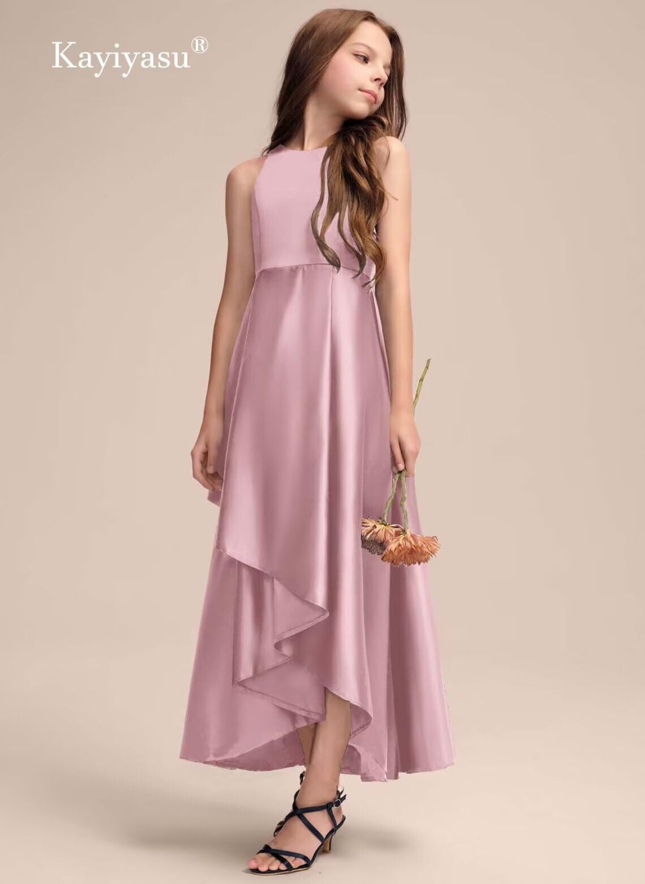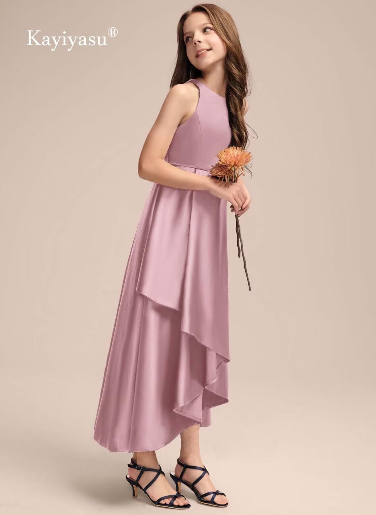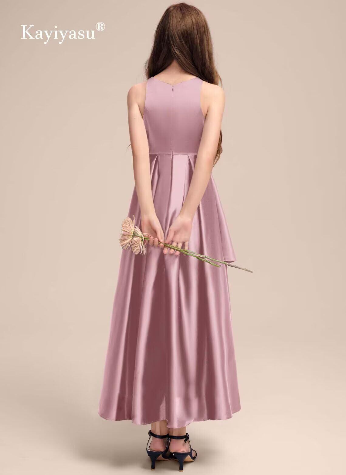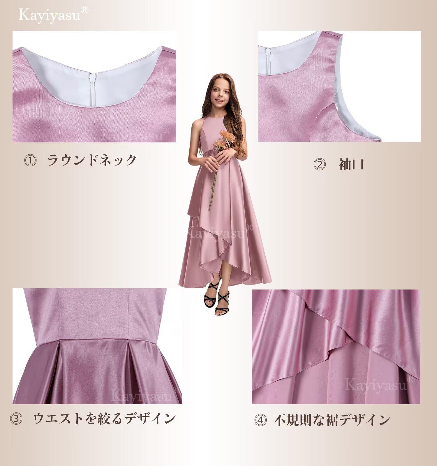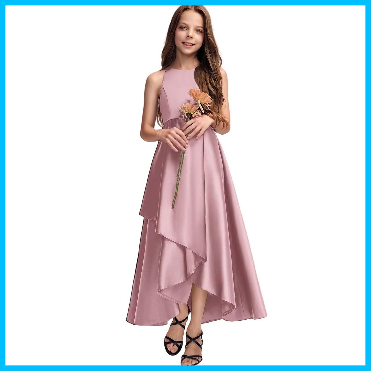 【デザイン】不規則なヘムラインのデザイン、高品質のサテン生地、子供のドレス全体はシンプルな無地のデザインで高級感を示しています。着脱が容易なバックジッパー。