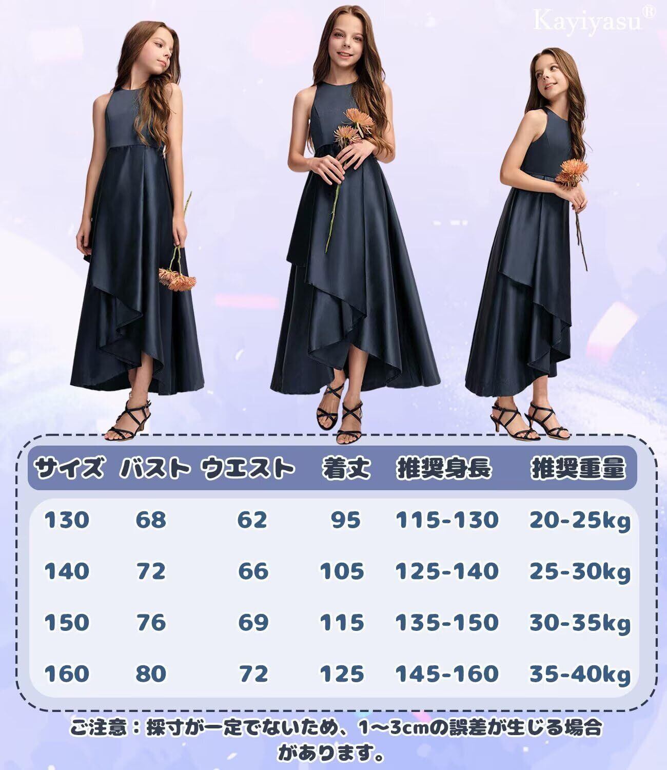 【高品質の子供ドレス】カラー:ネイビー、ブラック、ピンク、パープル;サイズ:130/140/150/160cm;(ご注意:スカートサイズは人工測定です,1-3cmの誤差があります。)上質なサテンキッズドレスです!