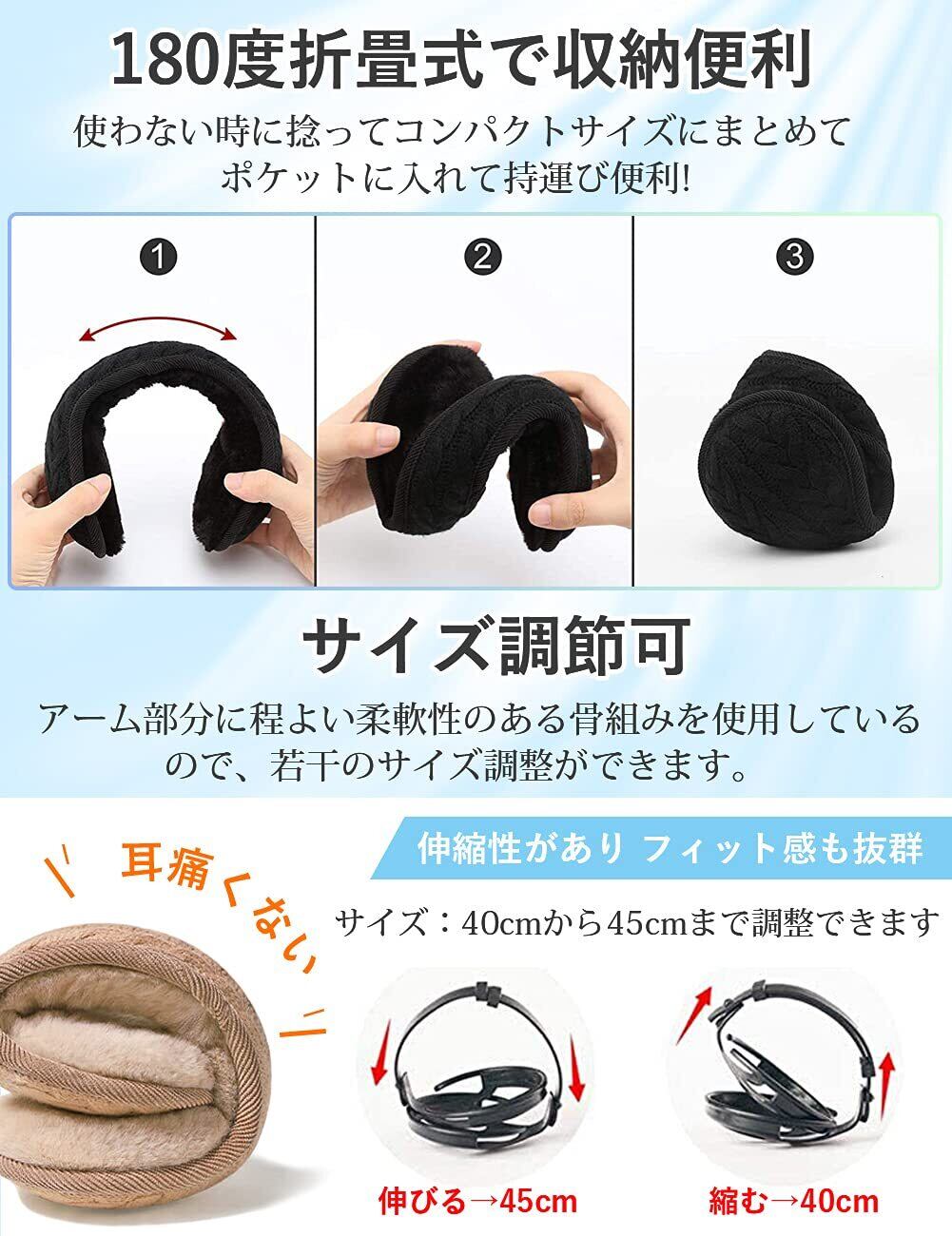 【180度折畳式で収納便利】バックアームタイプのイヤーマフで、ヘアースタイルを気にする心配無し!シンプルですっきりしたルックス、コーデに馴染むカラーで通勤通学にもぴったり。アーム部分は程よい柔軟性のある素材。使用後に、耳に当たる左右の部分を持ってくるっとねじるだけでコンパクトになって、ポケットやバッグに入れて収納できます。両側を持ってひねるだけの簡単、時間も力もいらない、外出時にとっても便利な折りたたみ式です!