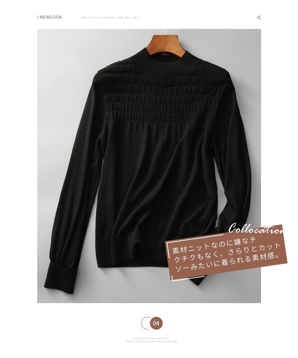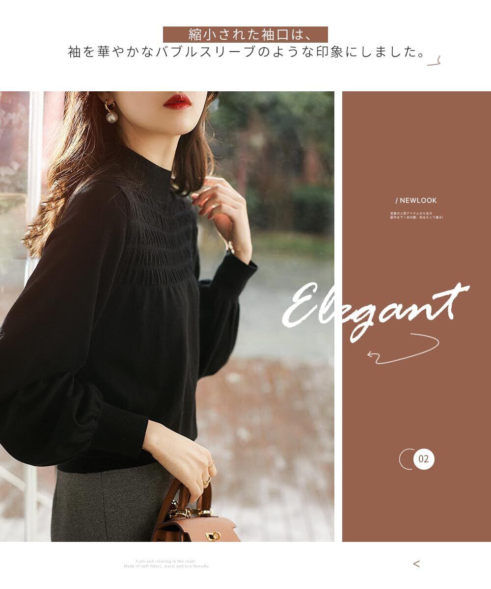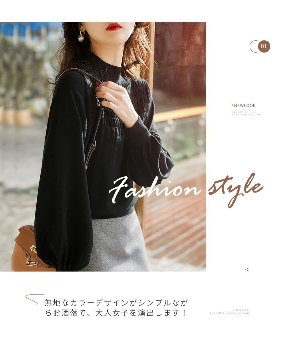小顔効果抜群の高めのハイネックで、大人可愛いチェスターコートやアウターのインナーとしても大活躍してくれます。縮小された袖口は、袖を華やかなバブルスリーブのような印象にしました。胸元は細めの伸張ベルトを入れたデザインで、規則正しいシワを形成しているデザインでオシャレ感アップ!