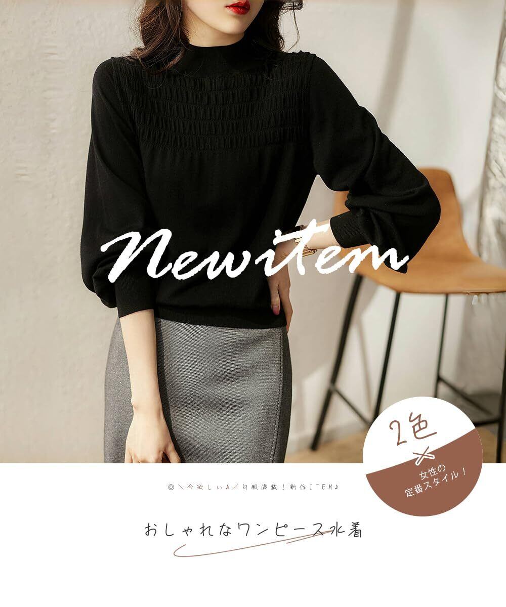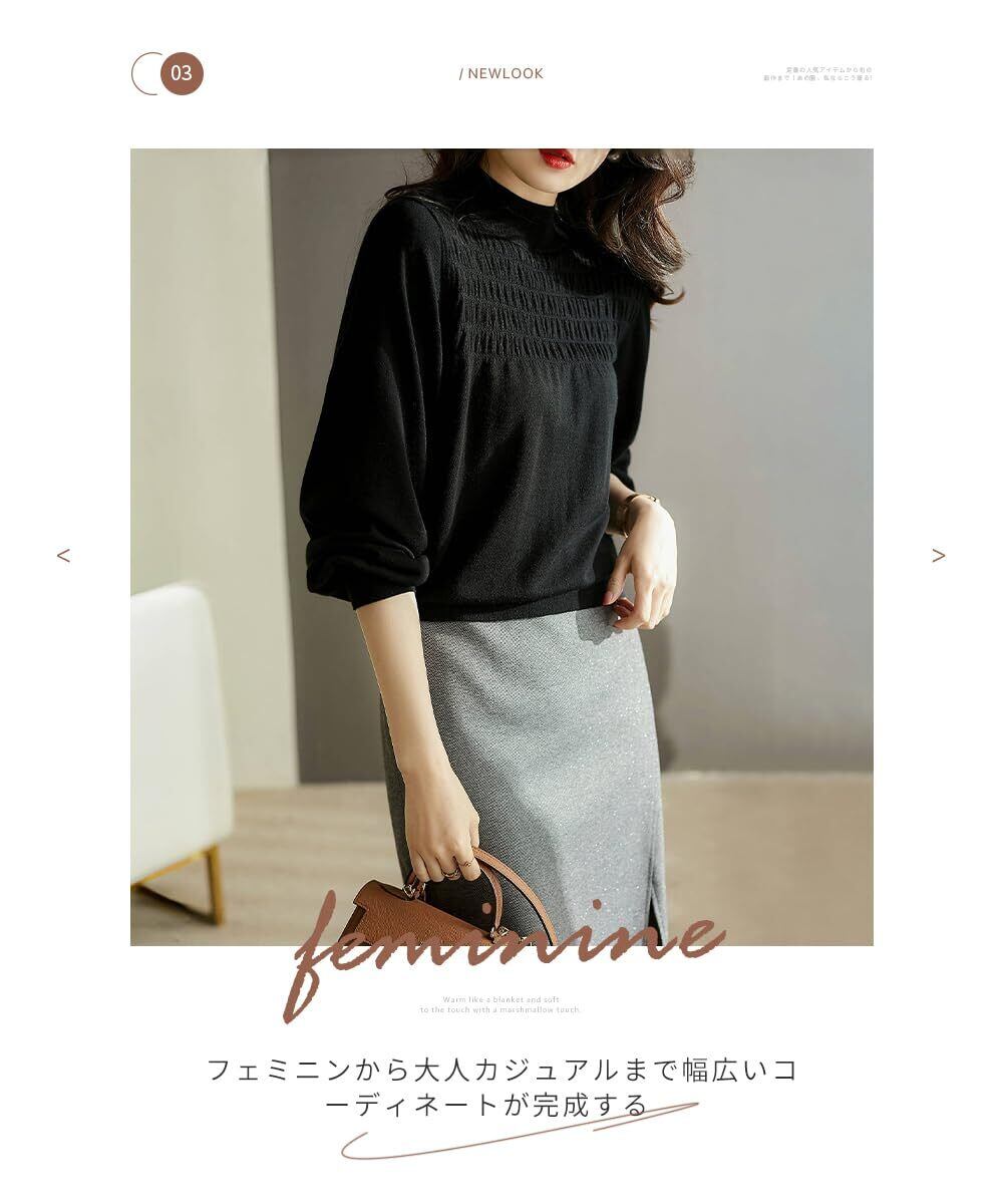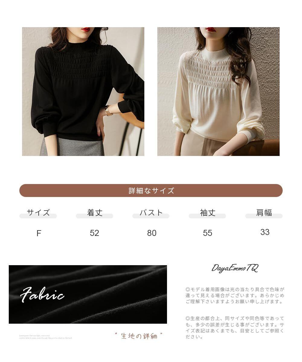 小顔効果抜群の高めのハイネックで、大人可愛いチェスターコートやアウターのインナーとしても大活躍してくれます。縮小された袖口は、袖を華やかなバブルスリーブのような印象にしました。胸元は細めの伸張ベルトを入れたデザインで、規則正しいシワを形成しているデザインでオシャレ感アップ!
