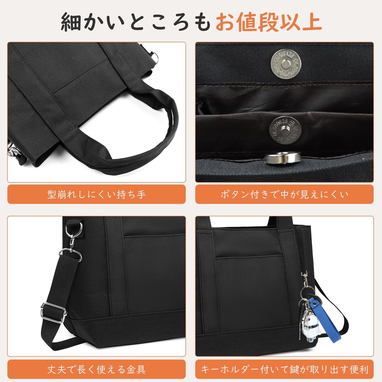 【優れた品質&細かいところもこだわり&安心の一年間保証】撥水加工の高品質素材を採用して、耐久性が高く、水に強く、汚れにくいミニトートバッグです。また細かいところもこだわります。持ち手はしっかりして長く使用できる上、鍵などを取り付けられるキーストラップも付き、落下防止のうえ、探す手間もとられず、使用する際にはスムーズに取り出しが可能です。マグネットボダンも高品質素材を使い、荷物が飛び出しにくくて、防犯性も持ちます。更に、弊社から購入されました商品は12ヶ月の保証期間をご提供しておりますから、何らか不明や状況があれば、ご注文番号をご用意の上、ご連絡いただけましたら、各種サポートを速やかに提供させていただきます。