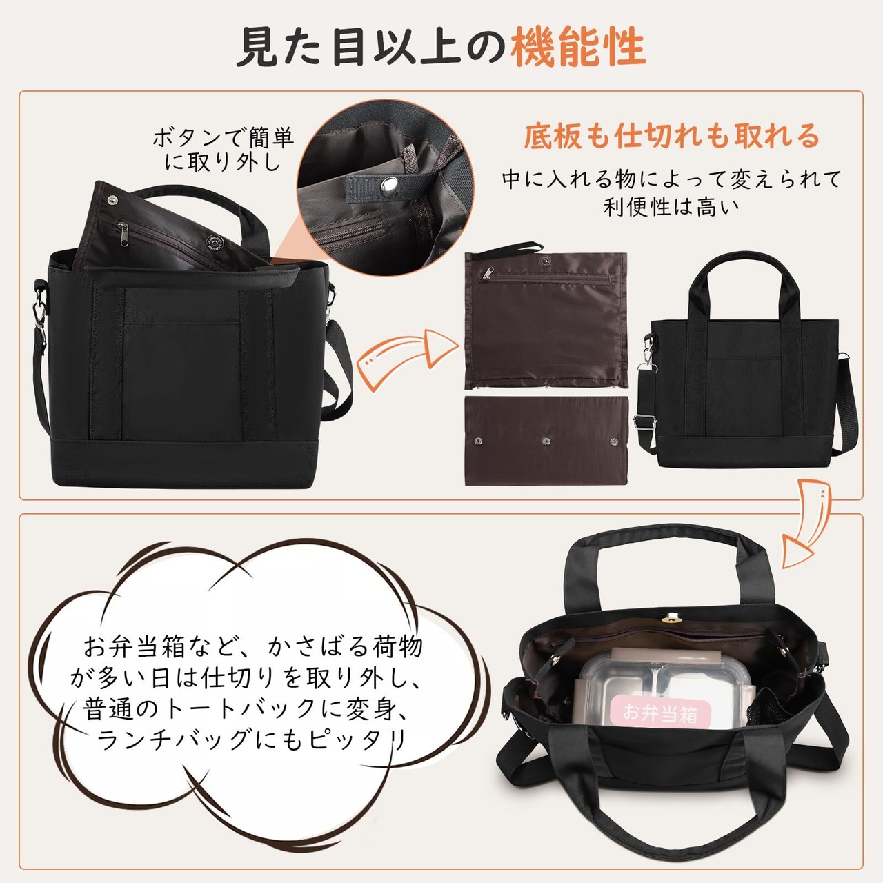 【3仕切りでスッキリ収納&見た目以上の収納力と機能性】本レディース&メンズトートバッグはコンパクトだけど、3つの仕切りデザインと合計7つの収納ポケットがあり、ペットボトルは立てて収納できたり、長財布はもちろん、B5サイズノートなどの荷物もサッと入れやすく、スッキリかつ楽に収納できます。見た目以上の収納力と機能性を持つ上、荷物はいつでも綺麗に整理整頓して入れられます。またお弁当箱など、かさばる荷物が多い日は仕切りを取り外して、普通のトートバッグに変身、ランチバッグにもピッタリです。さらに底板付きで多くの荷物を入れても安定して自立します。普段使いにも、通勤バッグや仕事用バッグにも使えます。