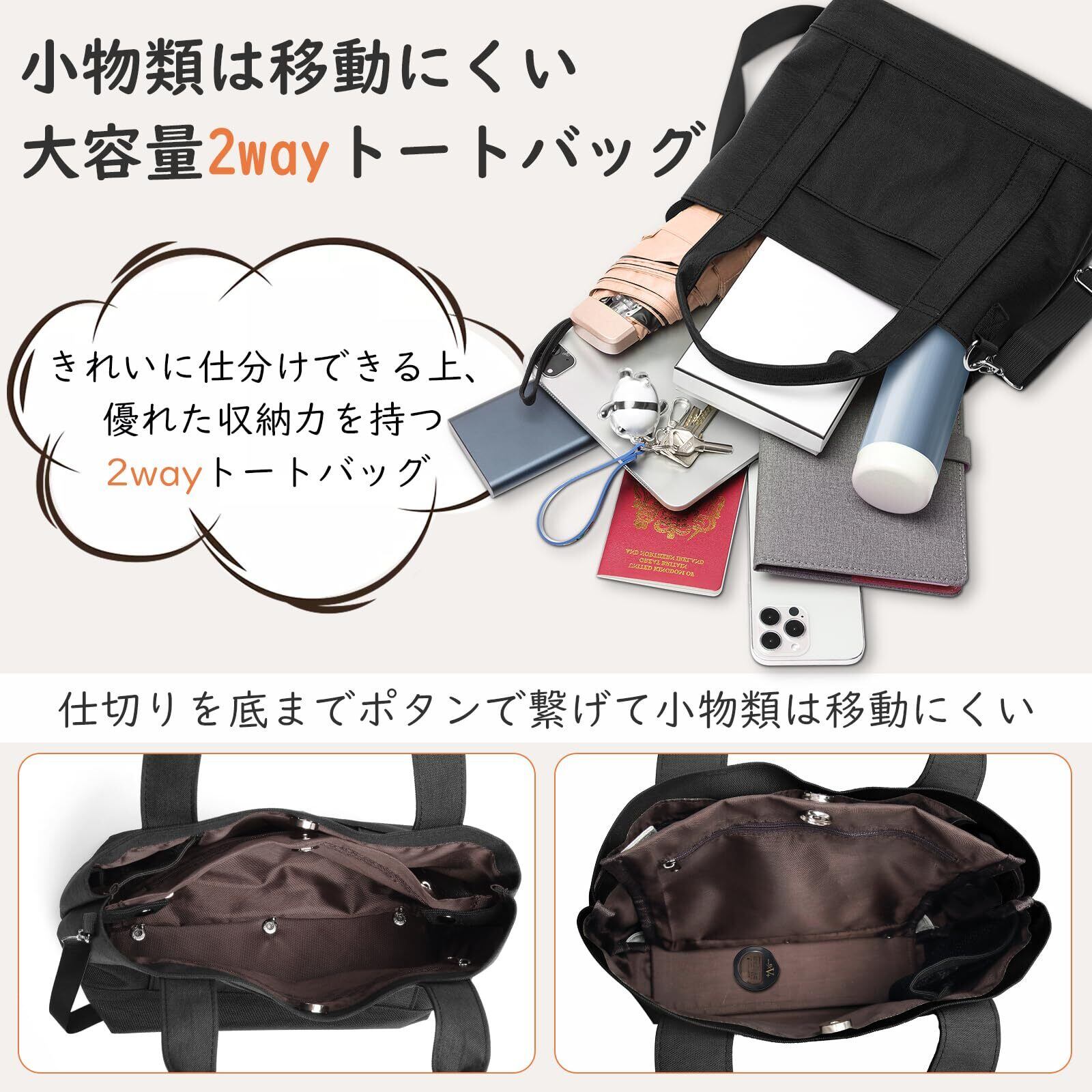 【商品特徴--小物類は移動にくい&商品仕様】仕切りを底までポタンで繋げて小物類は移動にくくて、肩にかけることも手で持つこともできる2way小さめトートバッグです。きれいに仕分けできる上、優れた収納力を持ち、軽量で持ち運びにも便利、デイリー使いにも、お出かけにも使えるショルダーバッグです。【商品仕様】製品サイズ:高さ22cm×幅24cm×マチ15cm 持ち手の高さ:14cm ショルダーベルトの長さ:54~100cm(長さ調整可能)■本体重量:約390g 外ポケット:1 内ポケット:3つの仕切りデザインと合計6つの収納ポケット