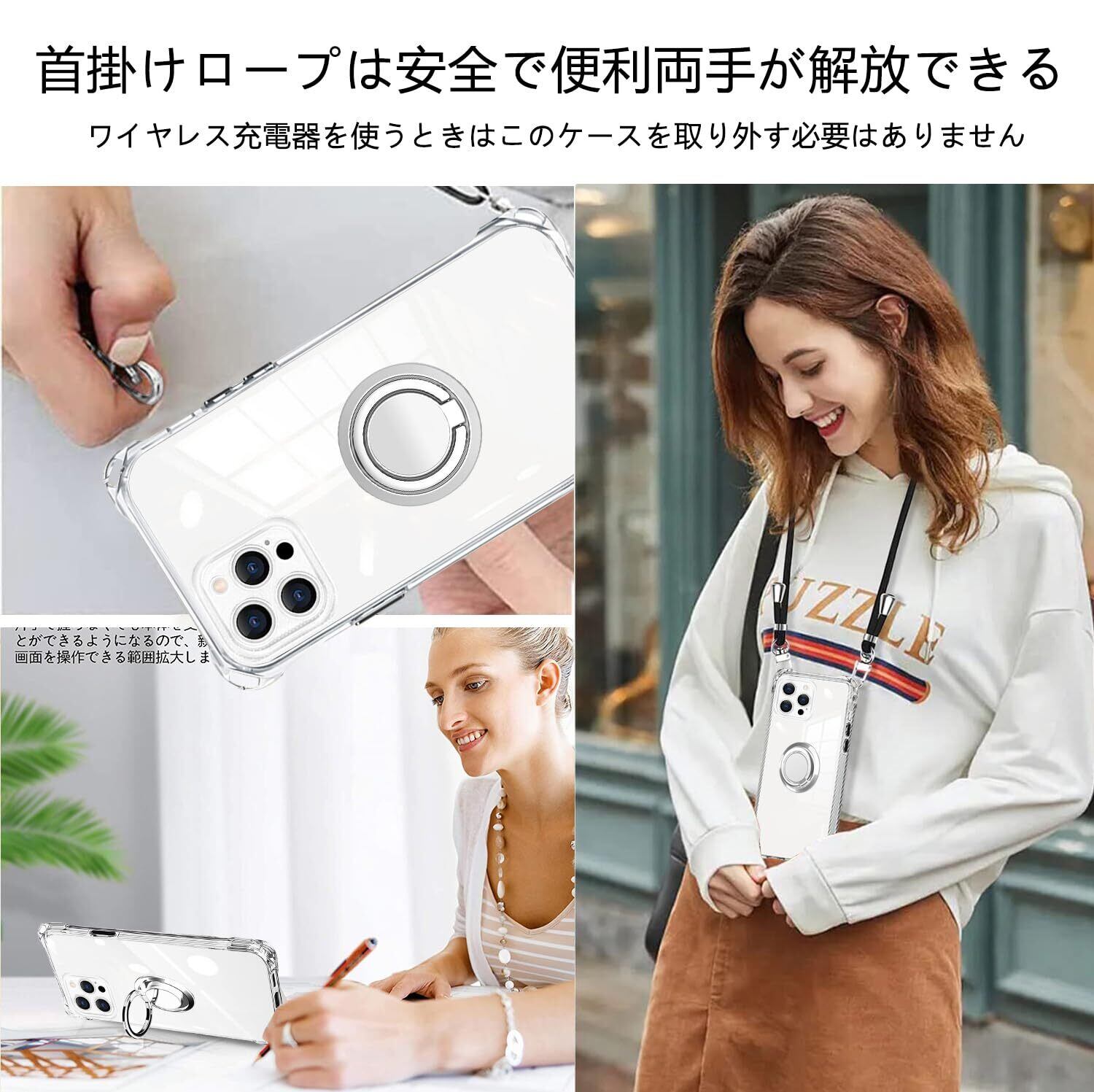 【リング付き機能】ケースを横置きにするとスタンド機能になり、持たず動画鑑賞などを楽しむことができます。リングは360度回転可能、180角度調節可能。一指着る式で、指がリングに通り抜け、片手で携帯を操作でき、落下防止します。ケースは柔らかいTPU素材を使用し、本体との擦れを防げ、ケースの着脱も簡単にできます。落下時には衝撃力を分散し、大事なデバイスを全面保護します。柔らかいナイロンストラップで首を快適に保ち、ストレッチの長さを調整でき、ストラップを取り外して、電話ケースを単独で使用できます。