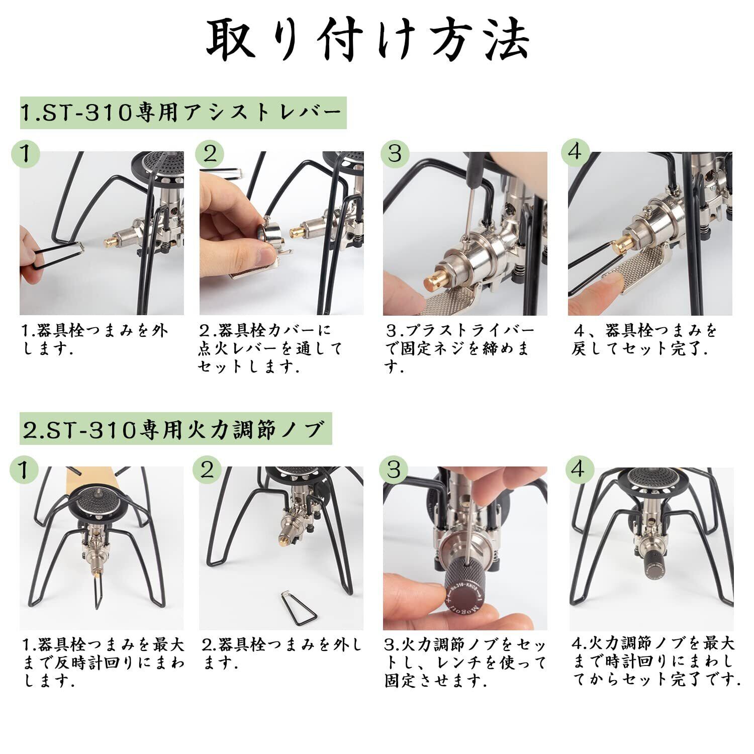 【専用アシスト三点セット】点火レバー+火力調節用ノブ+耐熱シリコンチューブの三点セットです。アシストレバーはST-310の操作性を劇的に改善してくれるアイテムです。st310は一度使用して、いったん消火したものを再度点火する場合に役立つ。そして火力調節用ノブはSoto st310 の操作感を上がることができます。耐熱シリコンチューブはST-310の脚に取付けることで、ゴトクのすべり止めや、ゴトクが熱くなったときのカバーになる。
