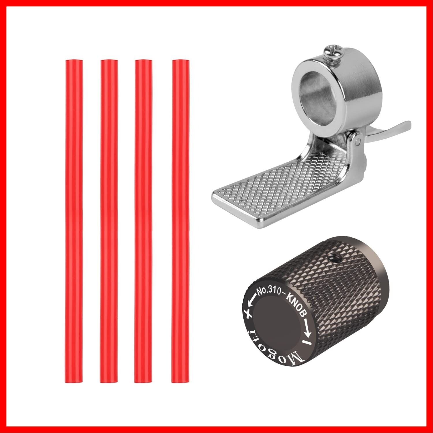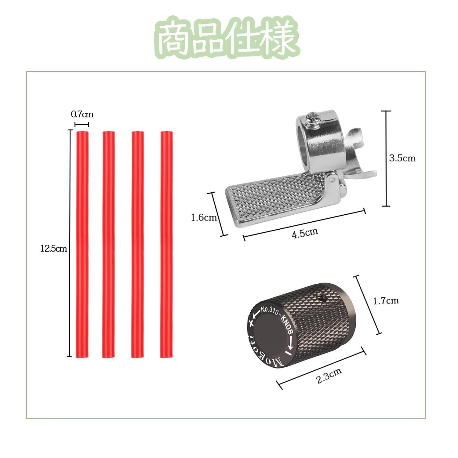 【商品仕様】点火アシストレバー:材質:合金 重量:26g サイズ:4.5×3.5cm 。耐熱シリコンチューブ:φ4-φ7×125mmカット済み4本、耐熱温度:-60~200℃。火力調節用ノブ:外径:1.7cm 長さ:2.3cm 重量:11g 付属品:六角レンチx1。