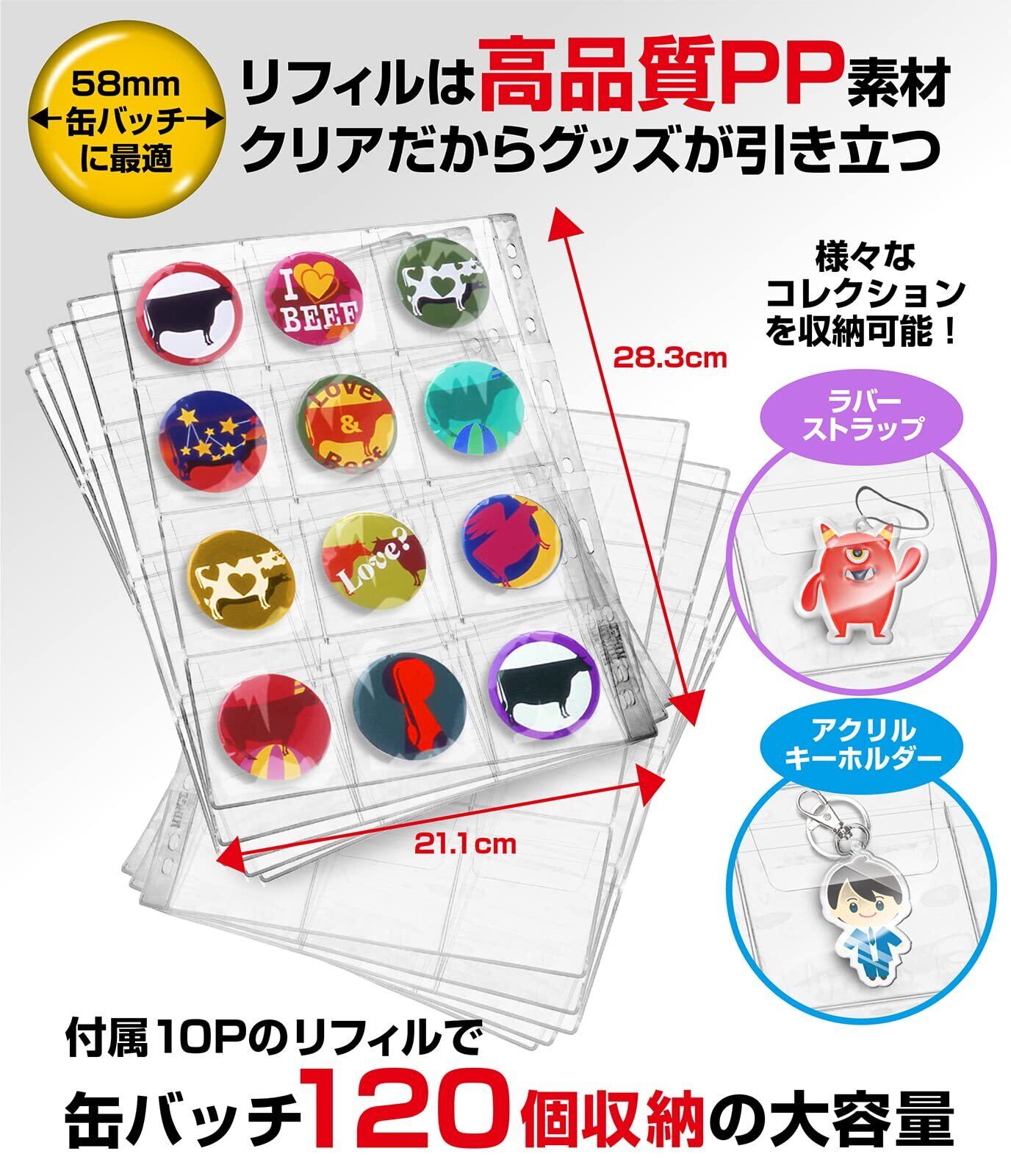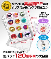 【大容量 リフィル10枚】 リフィルは1枚毎に缶バッジを12個収納することができます。リフィル10枚で最大120枚もの缶バッジ、ラバスト、アクキーを収納することができます。大切なコレクションを一度に沢山鑑賞したい方には特におすすめです。