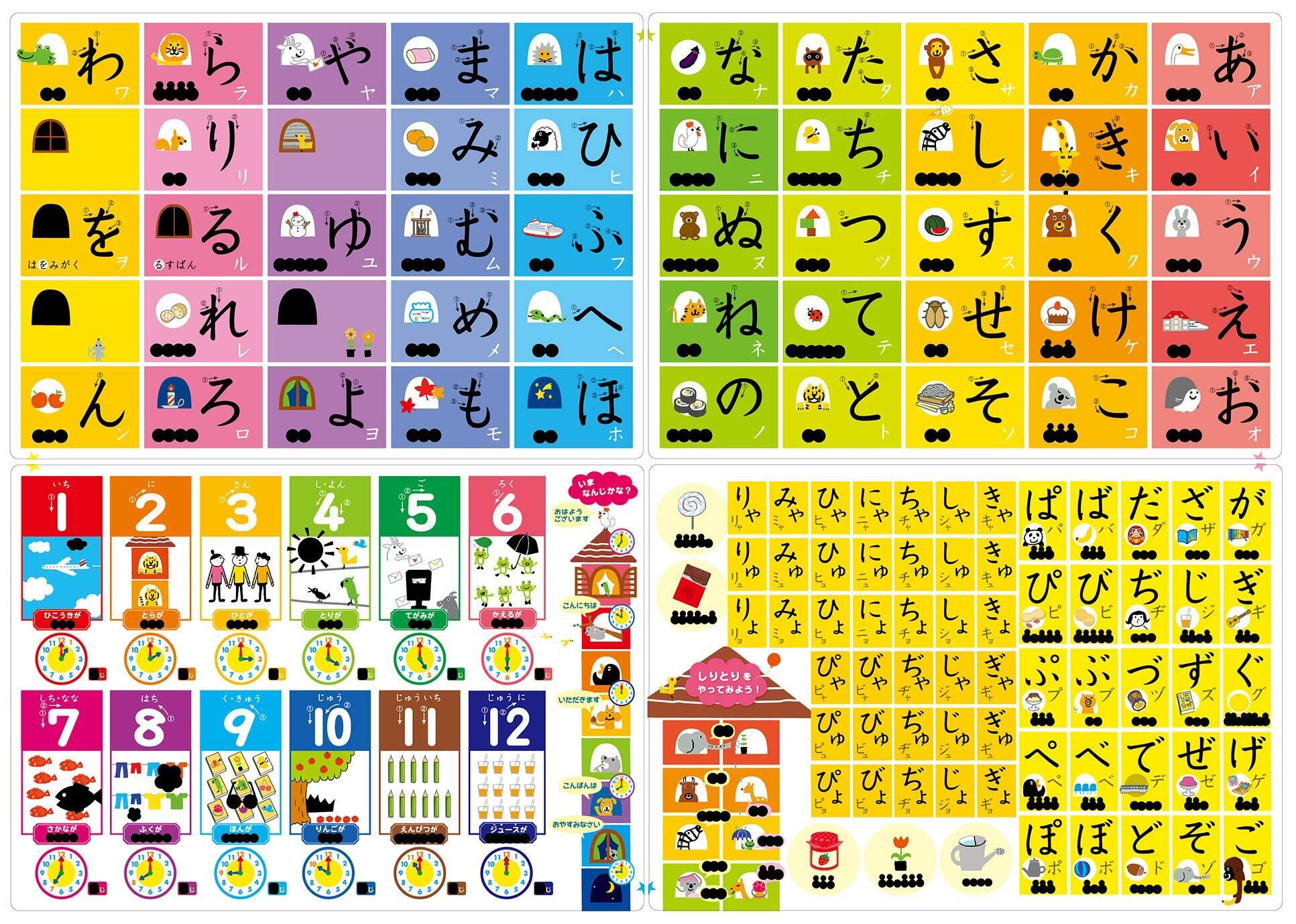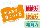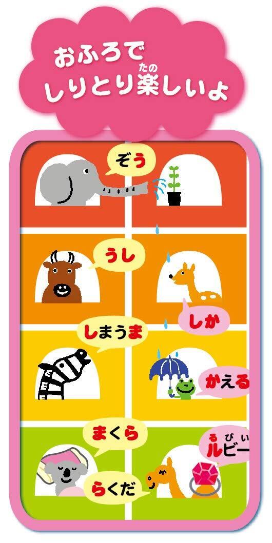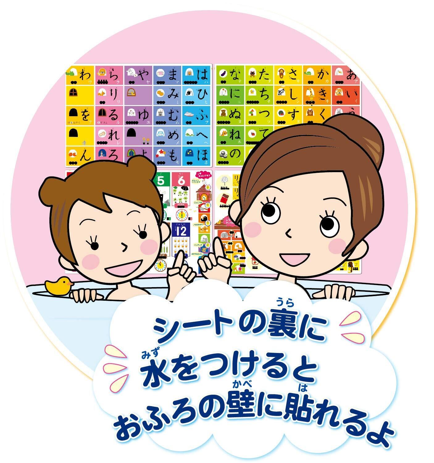 おふろの壁に水をつけてシートを貼ったり、湯船に浮かべたりして、表を見て声に出しながらひらがなやカタカナ、物の名前や数字を覚えましょう。
