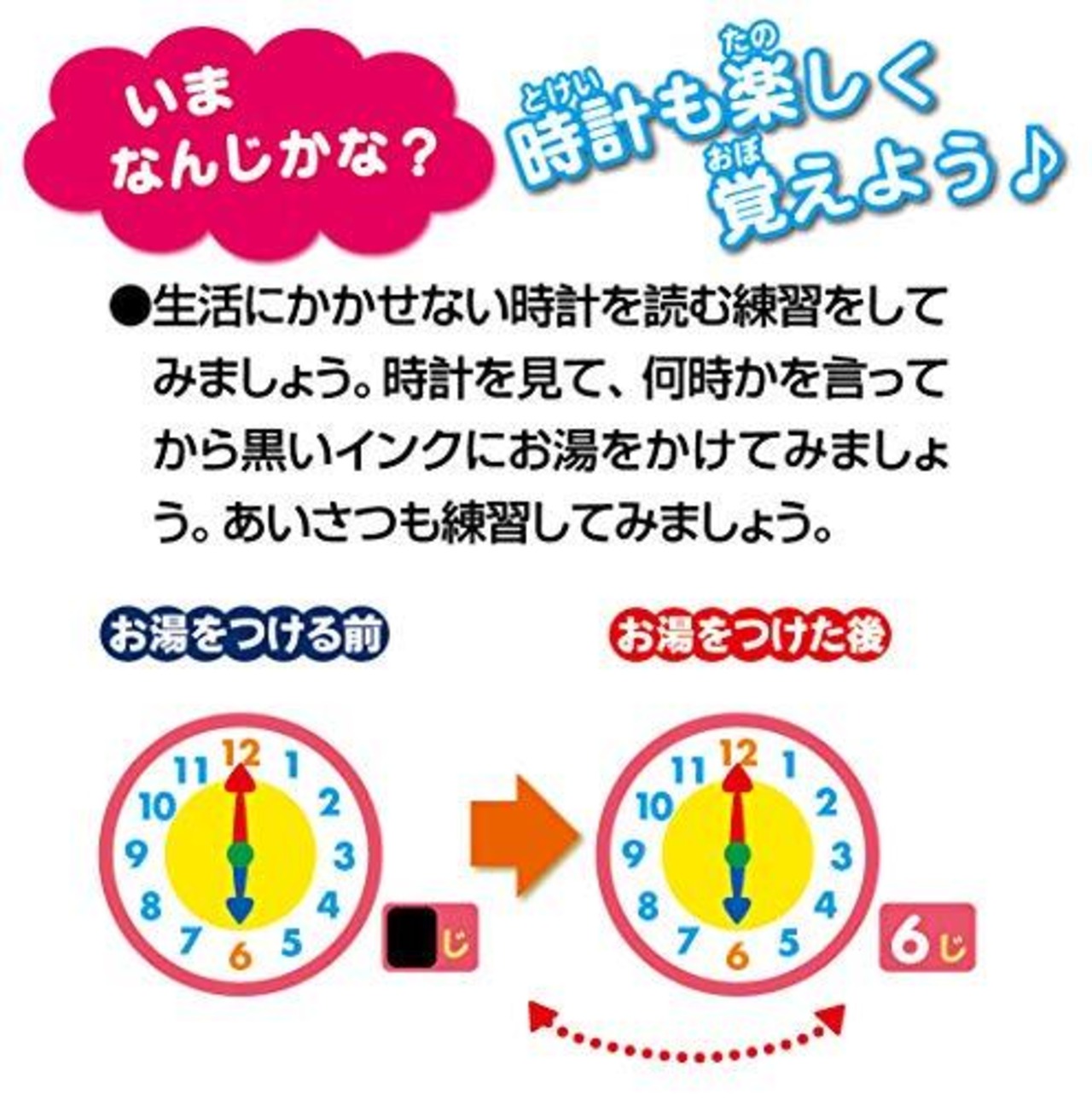 黒い丸にお湯をつけると文字やイラストが現れる感温インク付き!もじ・かず・とけいが楽しく学べます。