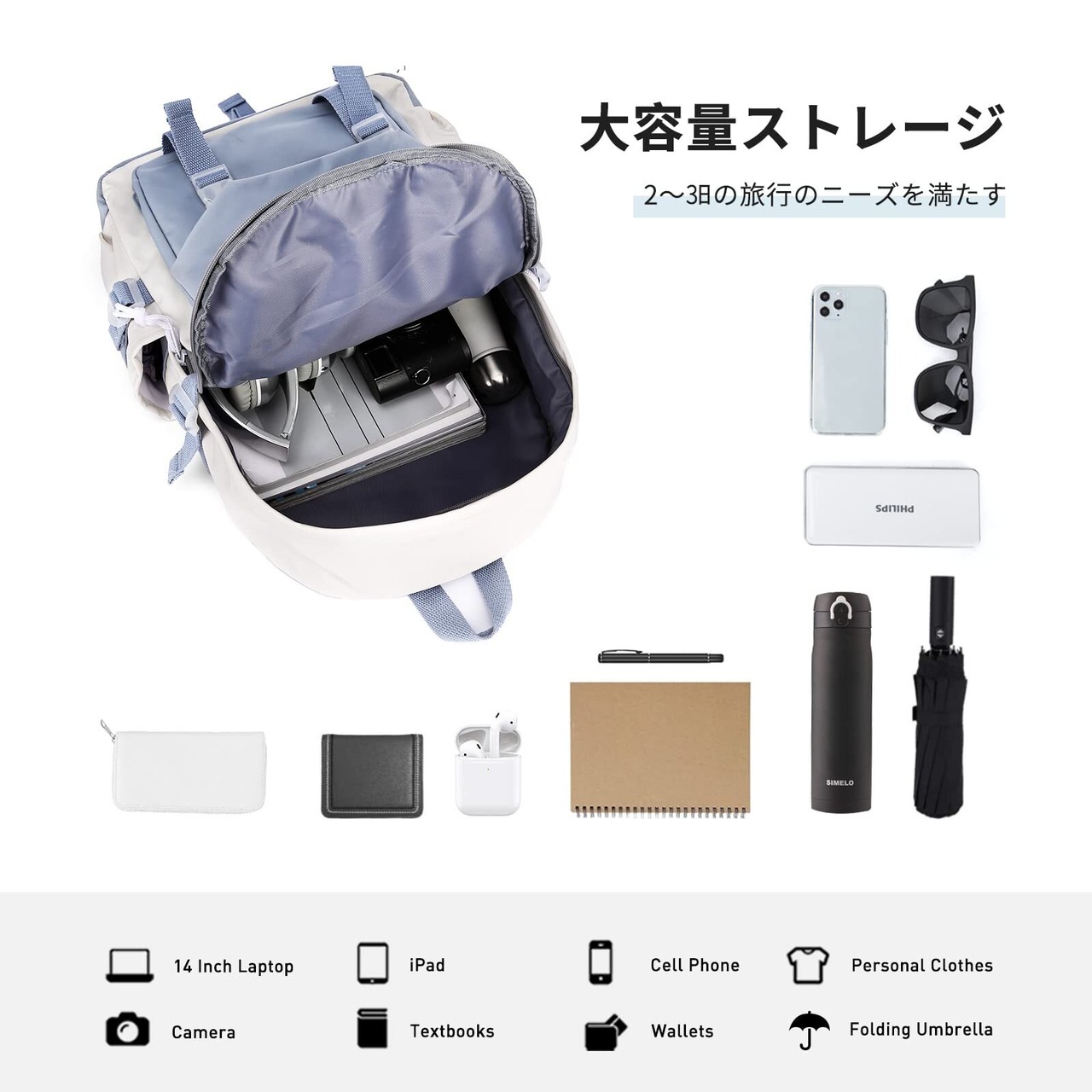 【多機能】様々な物品を必要に応じて収納できます。メインバッグは服、タオル、本などの比較的に大きな物を、内部の仕切りは14インチのノートパソコンを収納可能。また、正面ファスナーポケットはティッシュ、バスカード、鏡などの小物を、両サイドのポケットはペットボトルや傘を収納できます。更に、裏のファスナーポケットに入れたものは盗難にあう確率は極めて低いので、鍵や財布などの貴重品の一時保管には最適です。