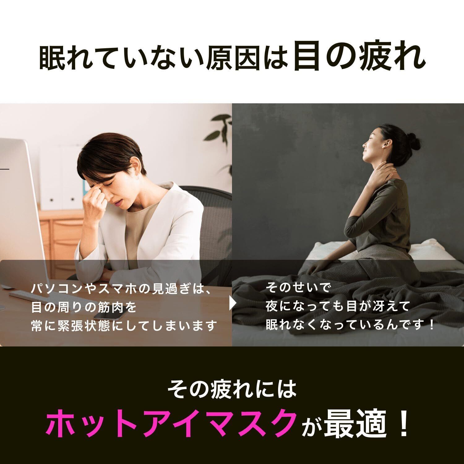 【 じんわり目を暖めてアイケアリラックス 】40〜50度の2段階あたためモードで疲れた目元を温めリラックスできるアイマスクです。普段から目をよく使う方、目元が疲れやすい方におすすめです。