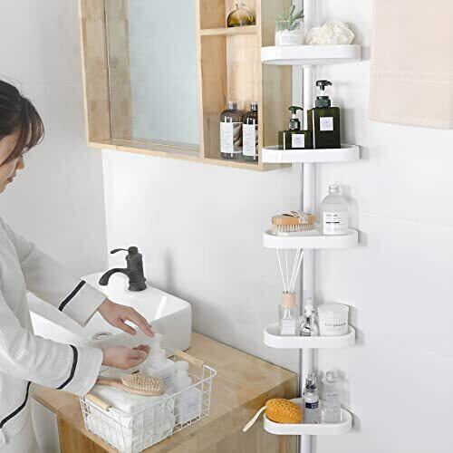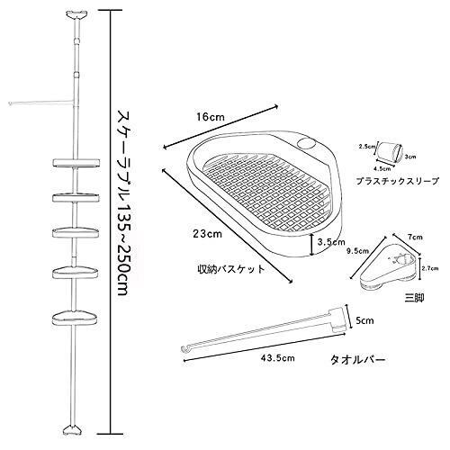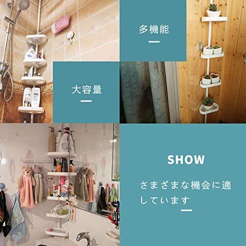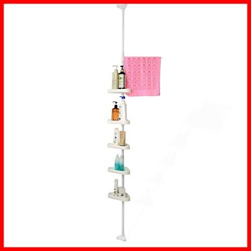 浴室収納 ラック コーナーラック 5段式 突っ張り棒 浴室つっぱりラック 伸縮棒 シャンプー ラック お風呂 高さ188〜250㎝調整可能 三 ホワイト 日本語説明書付き