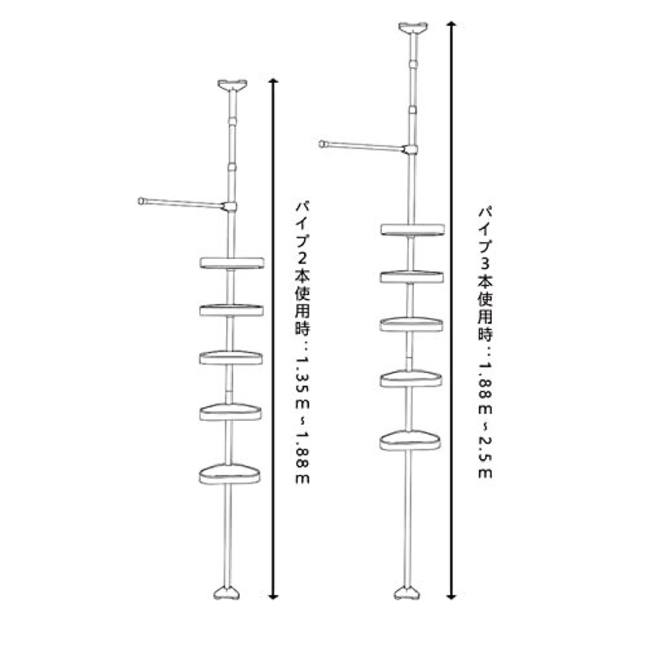 【製品仕様】素材:高炭素鋼&PP&ABS。製品サイズ:サイズを調整できます(パイプ2本使用時:1.35m~1.88m、パイプ3本使用時:1.88m~2.5mで調節可)。天井にバスルームのコーナーを合わせます。このシャワーキャディポールは丈夫で丈夫です。シャワーやバスタブの隅にあるバスの必需品を整理するのに役立ちます。