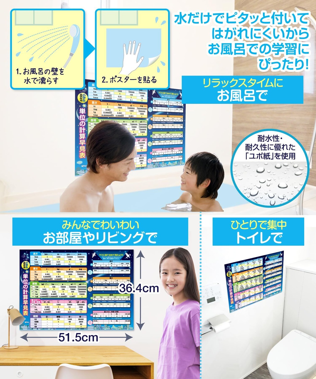 【耐久性と安全性】 このポスターは耐水性があり、お風呂場でも使用できる素材で作られています。これにより、バスタイムを利用して楽しく学ぶことができ、いつでも単位換算の確認が可能です。また、丈夫な素材で作られているため、長期間使用しても劣化しにくく、安心して使い続けることができます。