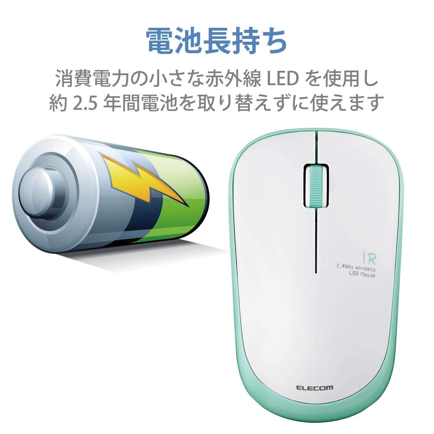 Blue LEDやレーザーを使用したマウスよりも消費電力が小さいため、約2.5年間電池を取り替えずに使用することが可能です。