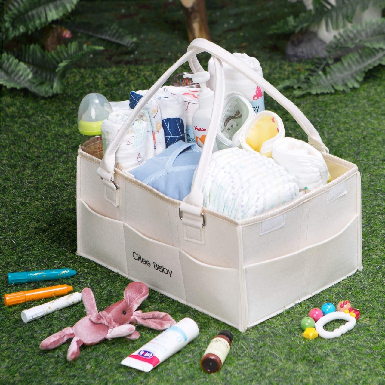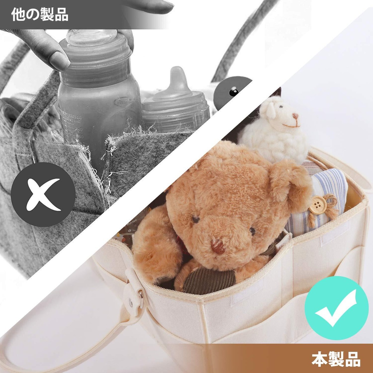 【商品詳細・持ち運び便利】:環境に優しいフェルト布; 【展開サイズ】:38×26×18cm; 【折り畳みサイズ】:38×18×4cm; 【取っ手長さ(取り外せるボタン式)】:50cm; 出産祝い、出産準備、ママへのプレゼントにおすすめです。