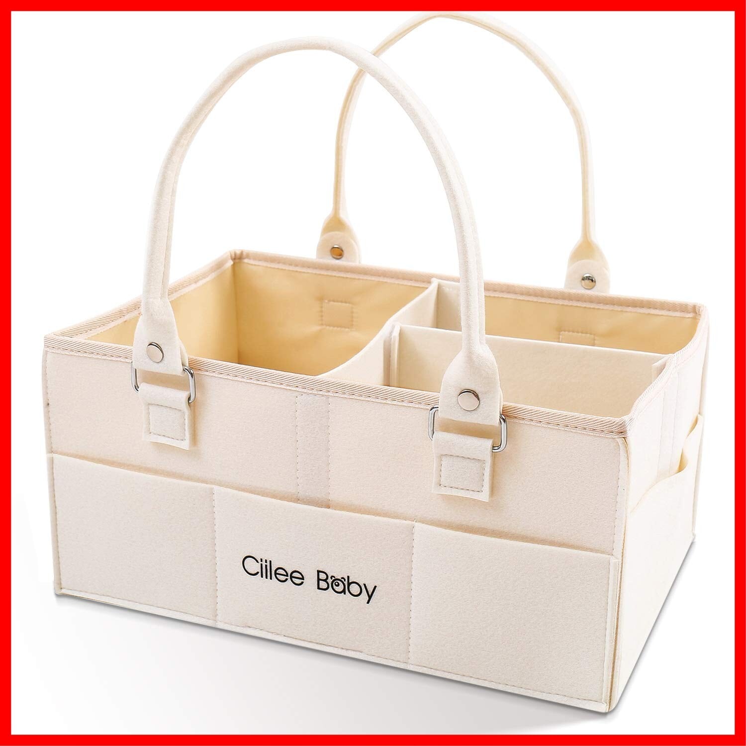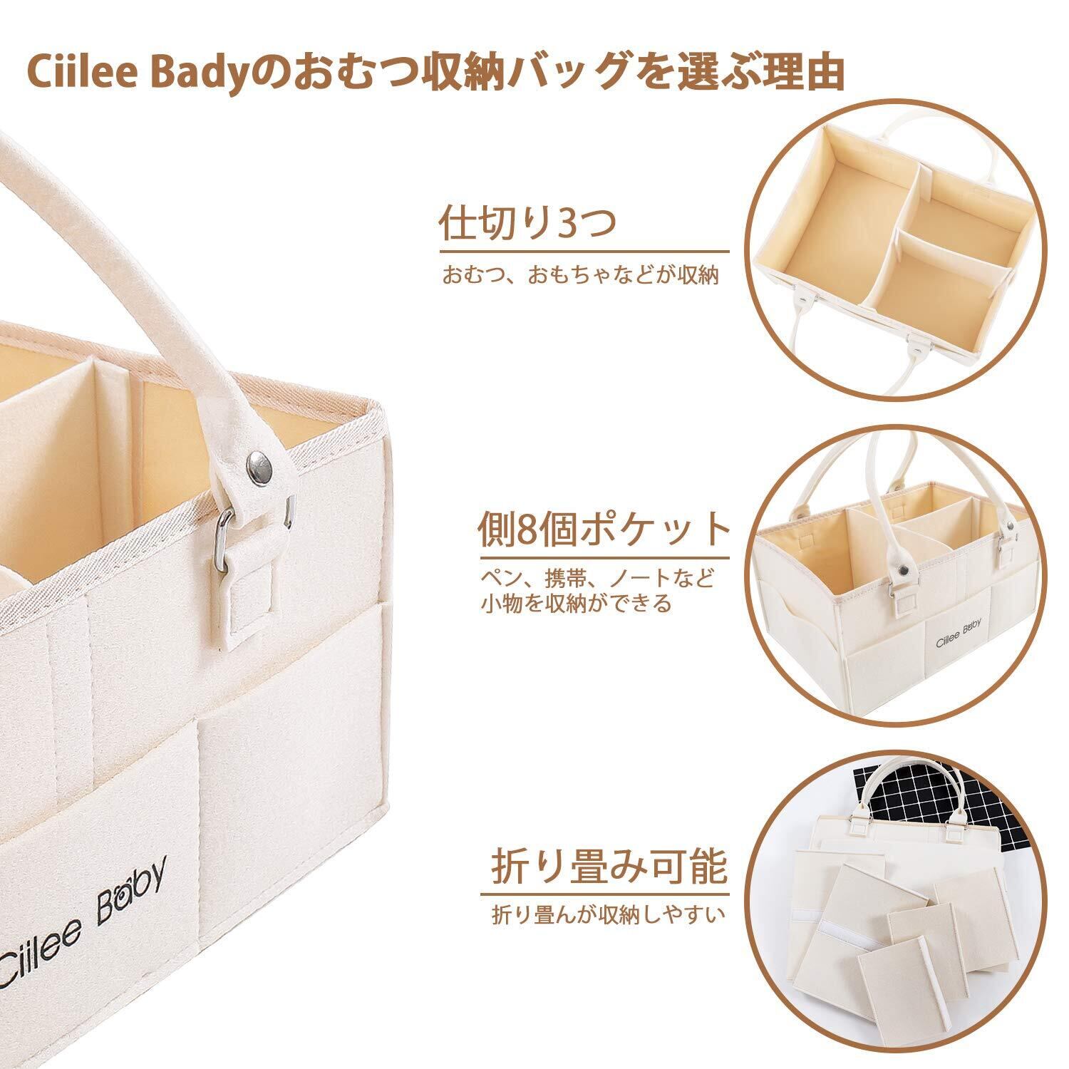Ciilee Baby おむつストッカー オムツバッグ 大容量 取り外せハンドル オムツケース 折りたたみ ベビー 収納ボックス カゴ 車載旅行用バック 収納カコ 小物入れ 軽便 ベビー用品 育児用品入れ (仕切り3つ(ベージュ))