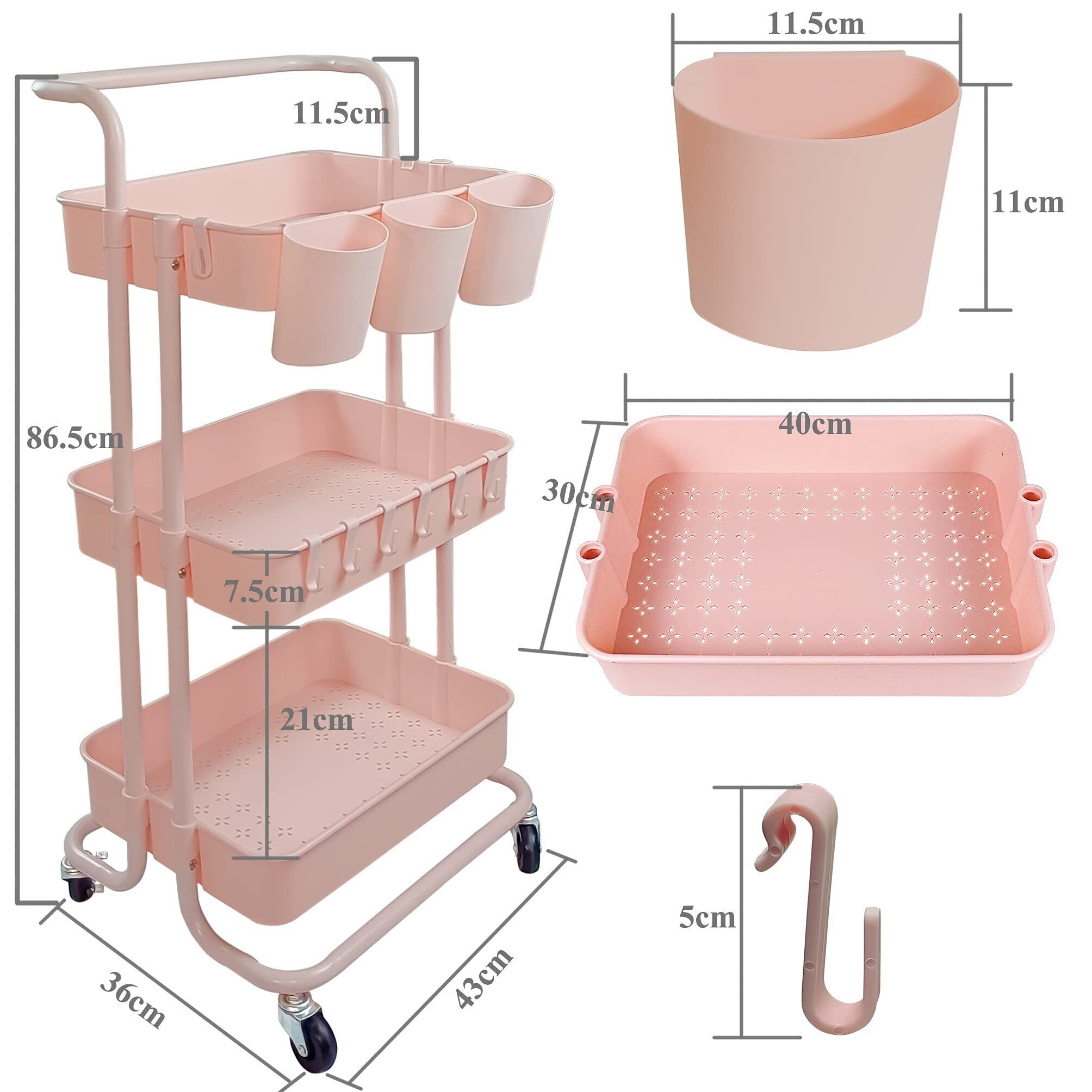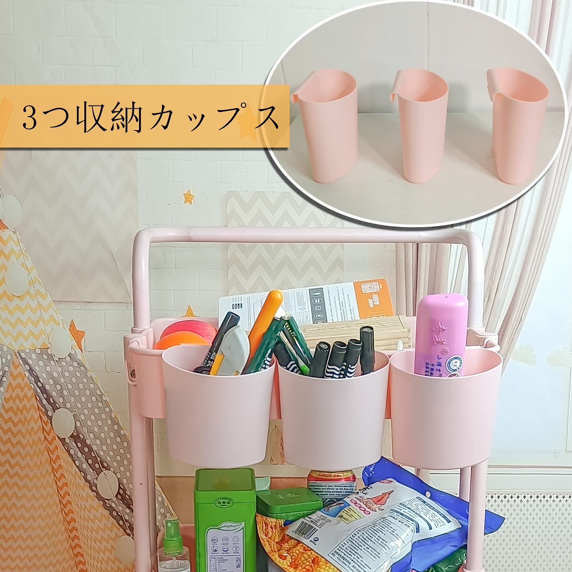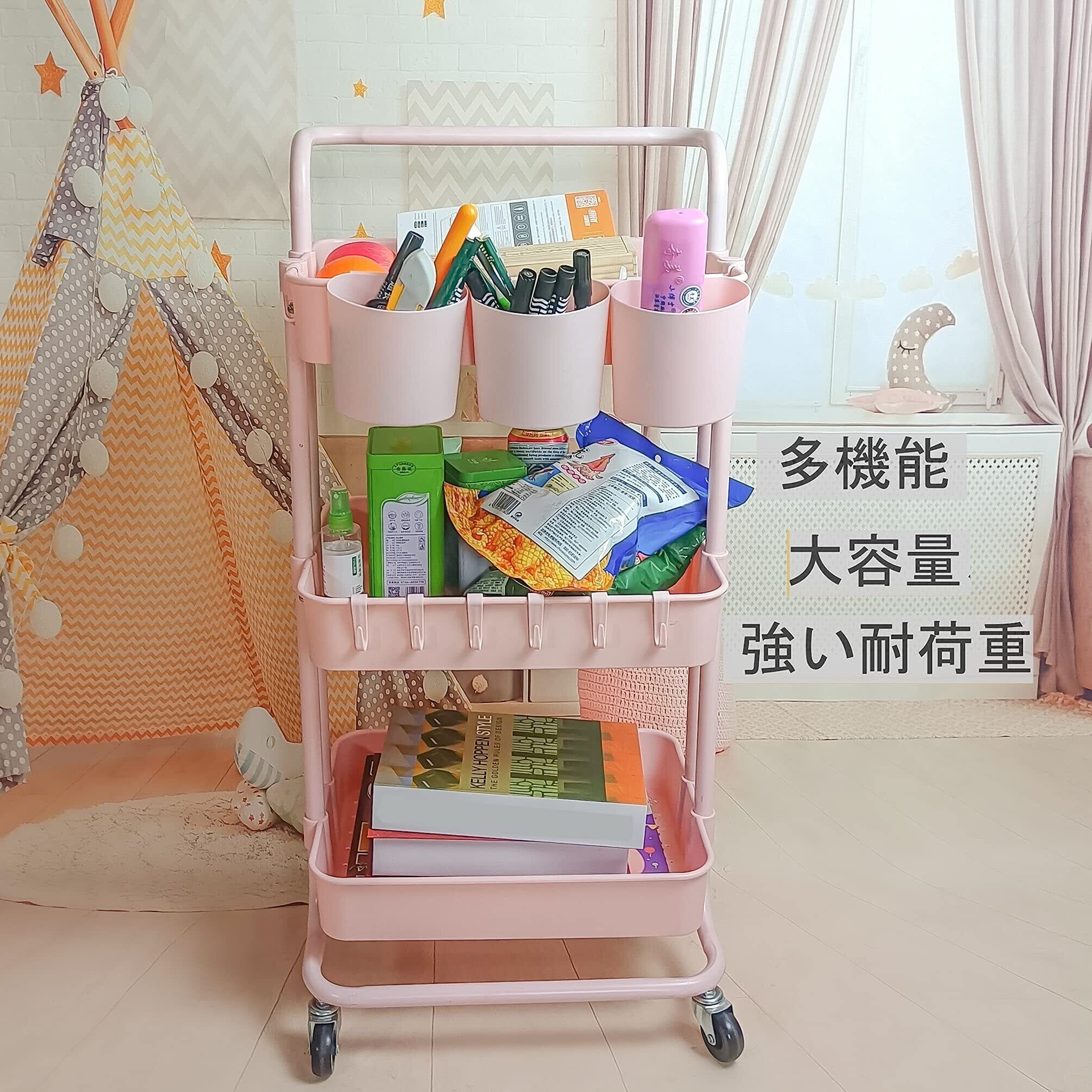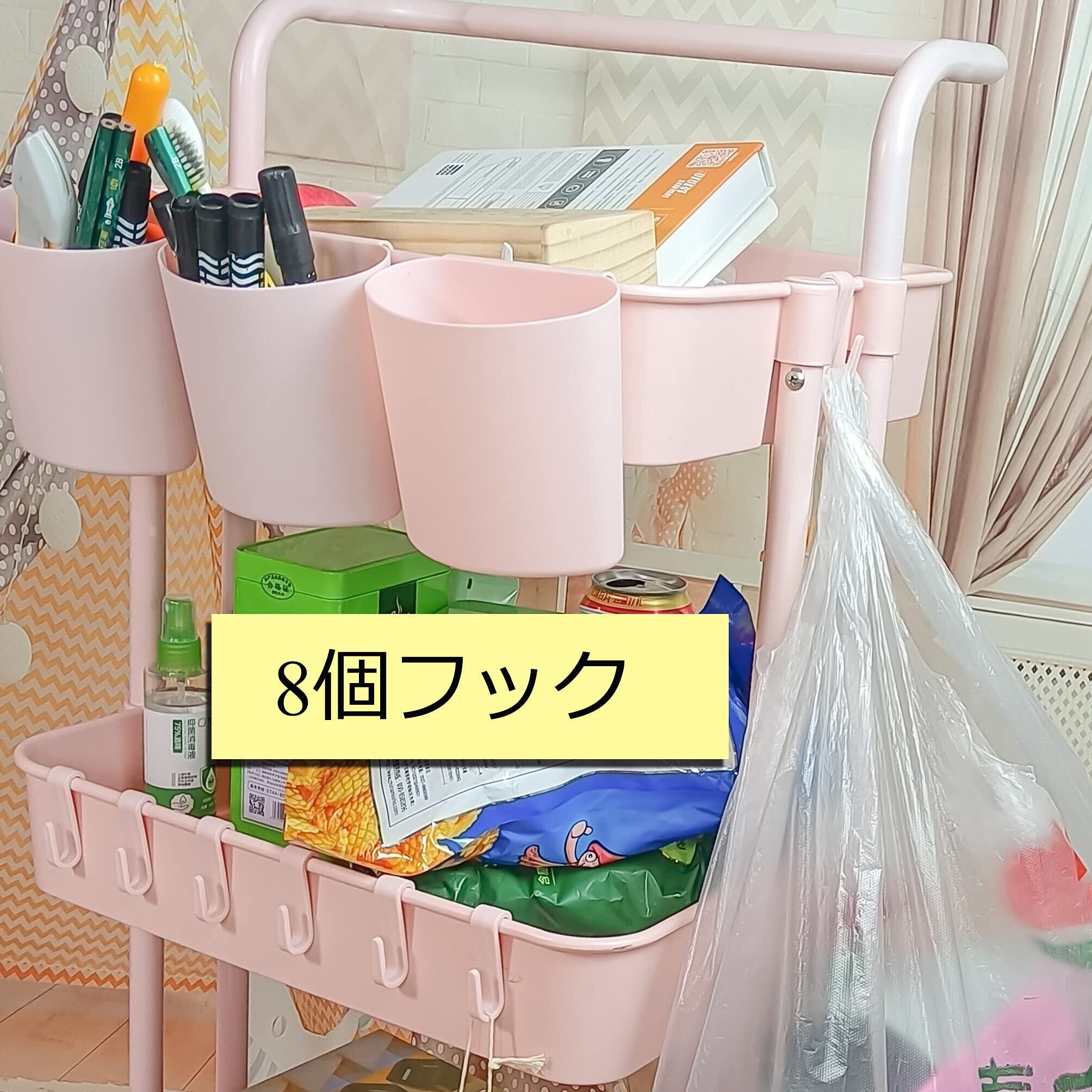 Ceeyali キッチン収納 バスケットトローリー キャスター付き 3段 マルチワゴン 収納ラック マルチワゴン キッチン収納 + 3つの収納カップ + 8フック 小物収納 耐荷重60kg (ピンク Pink)