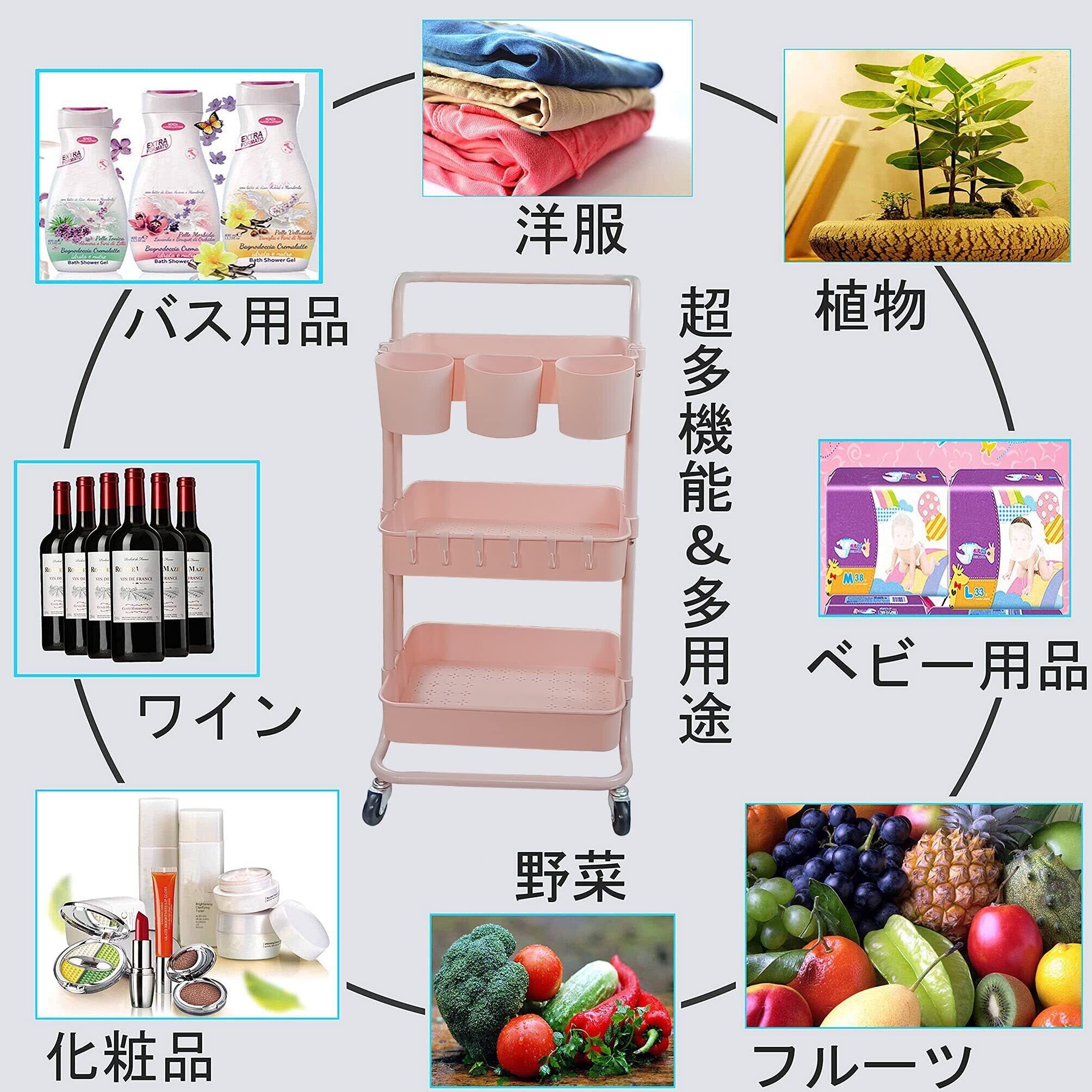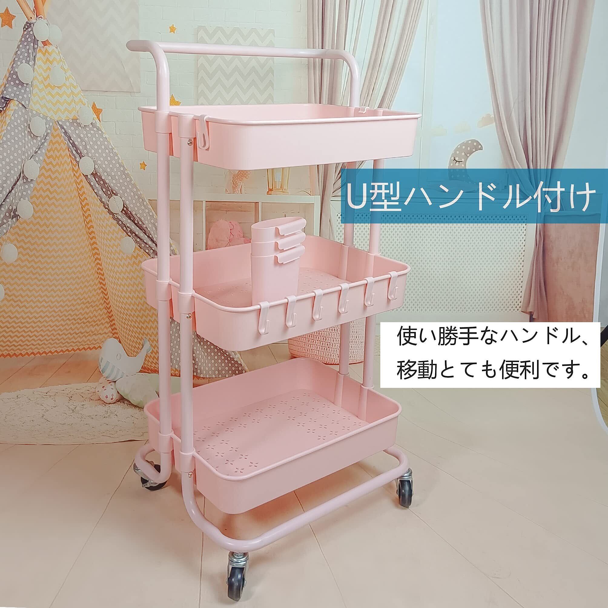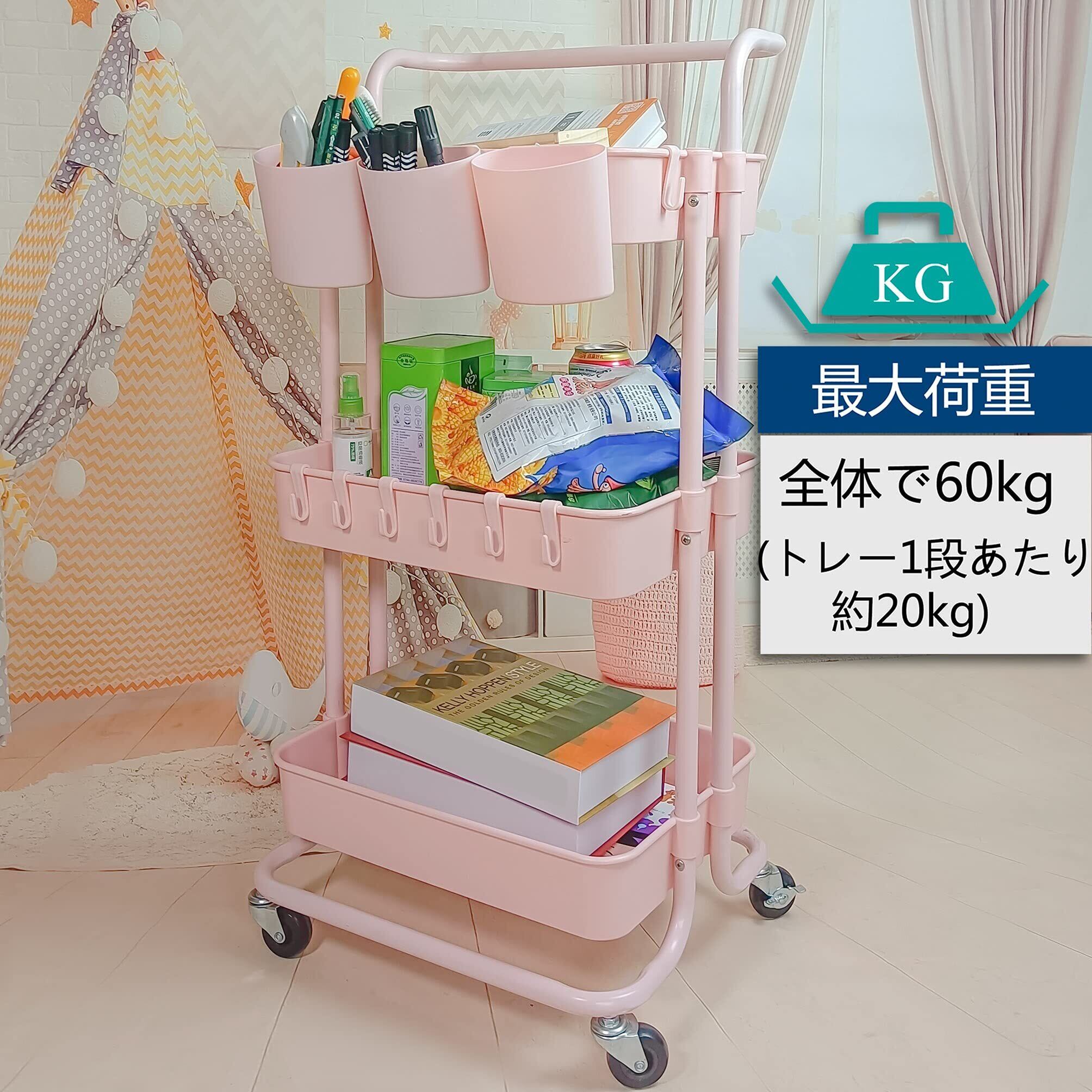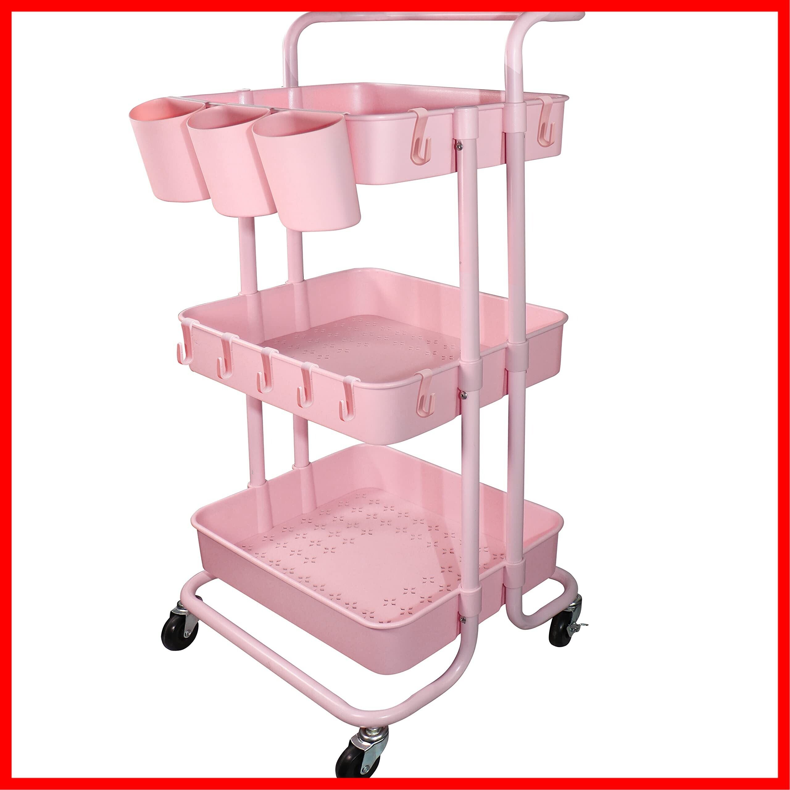 Ceeyali キッチン収納 バスケットトローリー キャスター付き 3段 マルチワゴン 収納ラック マルチワゴン キッチン収納 + 3つの収納カップ + 8フック 小物収納 耐荷重60kg (ピンク Pink)