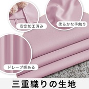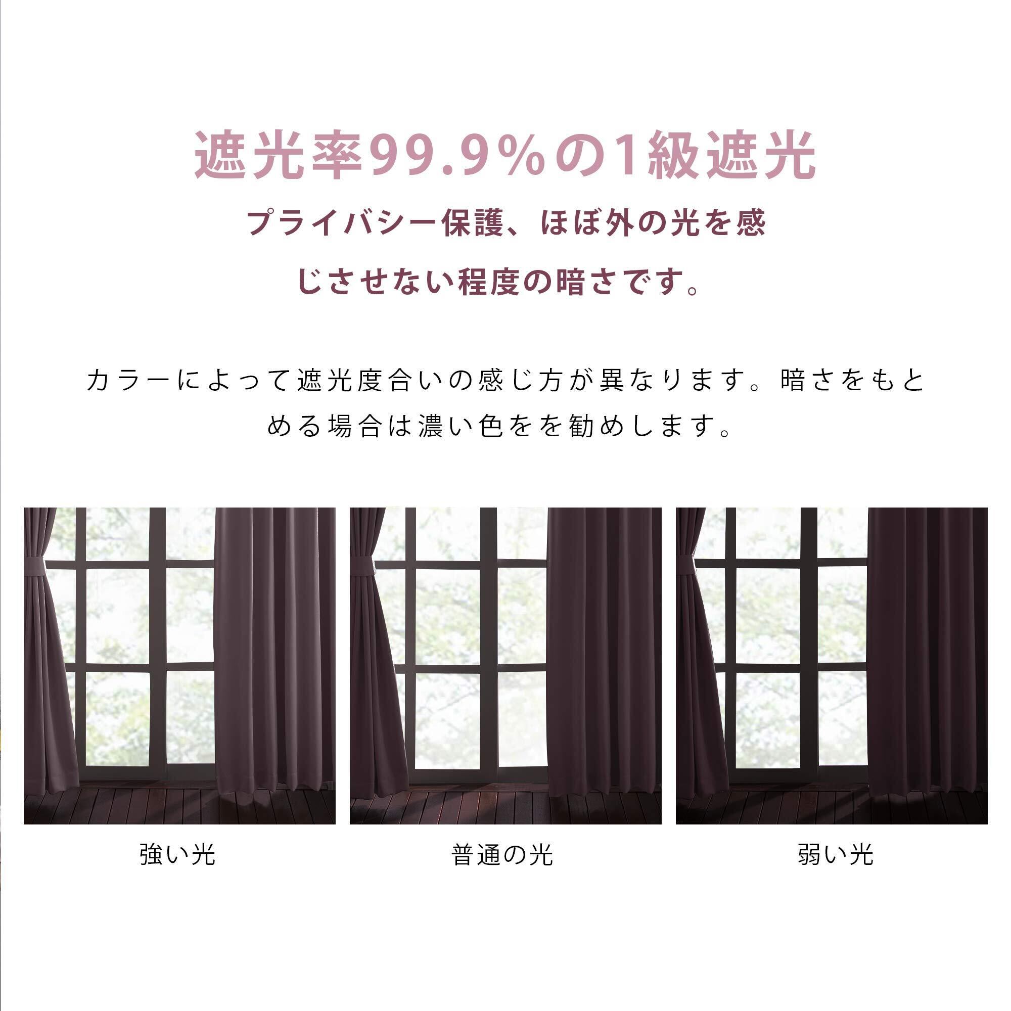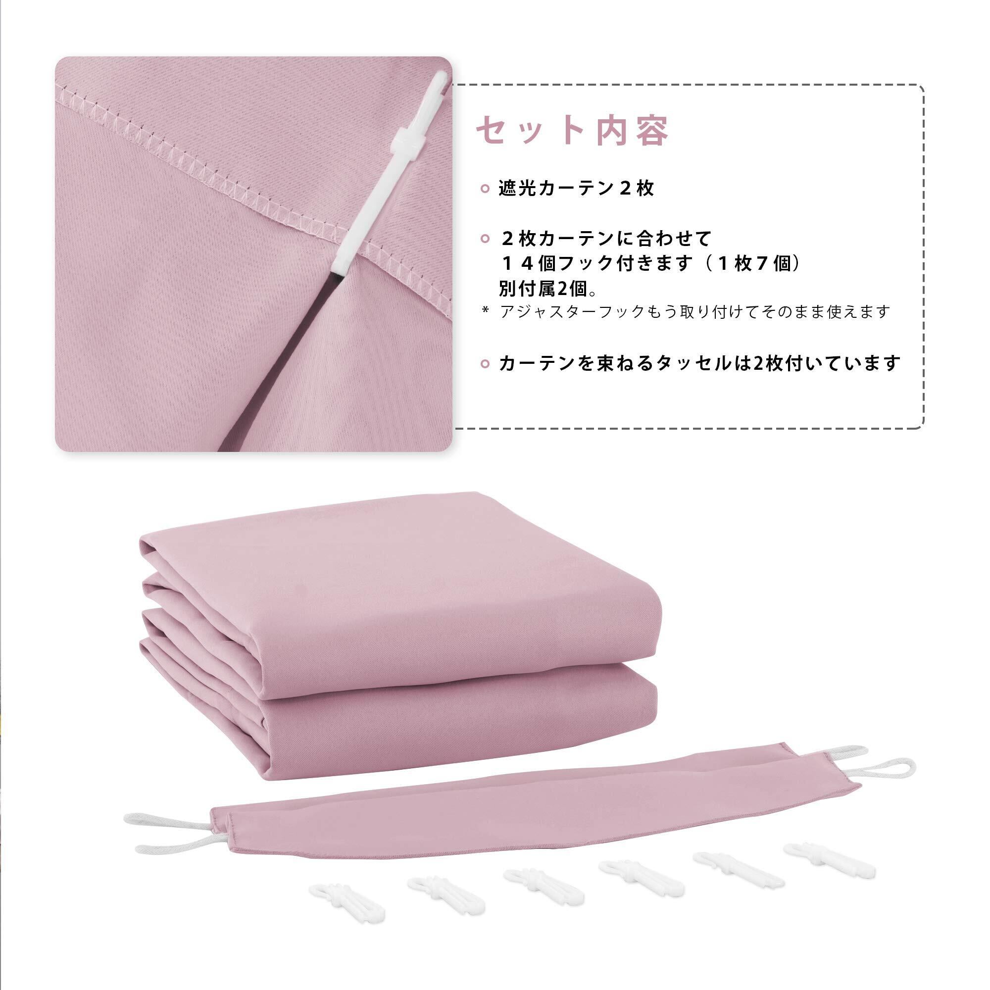 【縫製/付属品】1.5倍ヒダ・ 2ッ山 ・形態安定加工。遮光カーテン2枚入り、共布タッセル2枚付き、アジャスターフック14本付き(予備フック2本)、高さ6cmまで、14段階調節可能です。100%ポリエステルより、耐久性がよい。厚地の生地が絹のような滑らか、輝いているさま光沢があります。