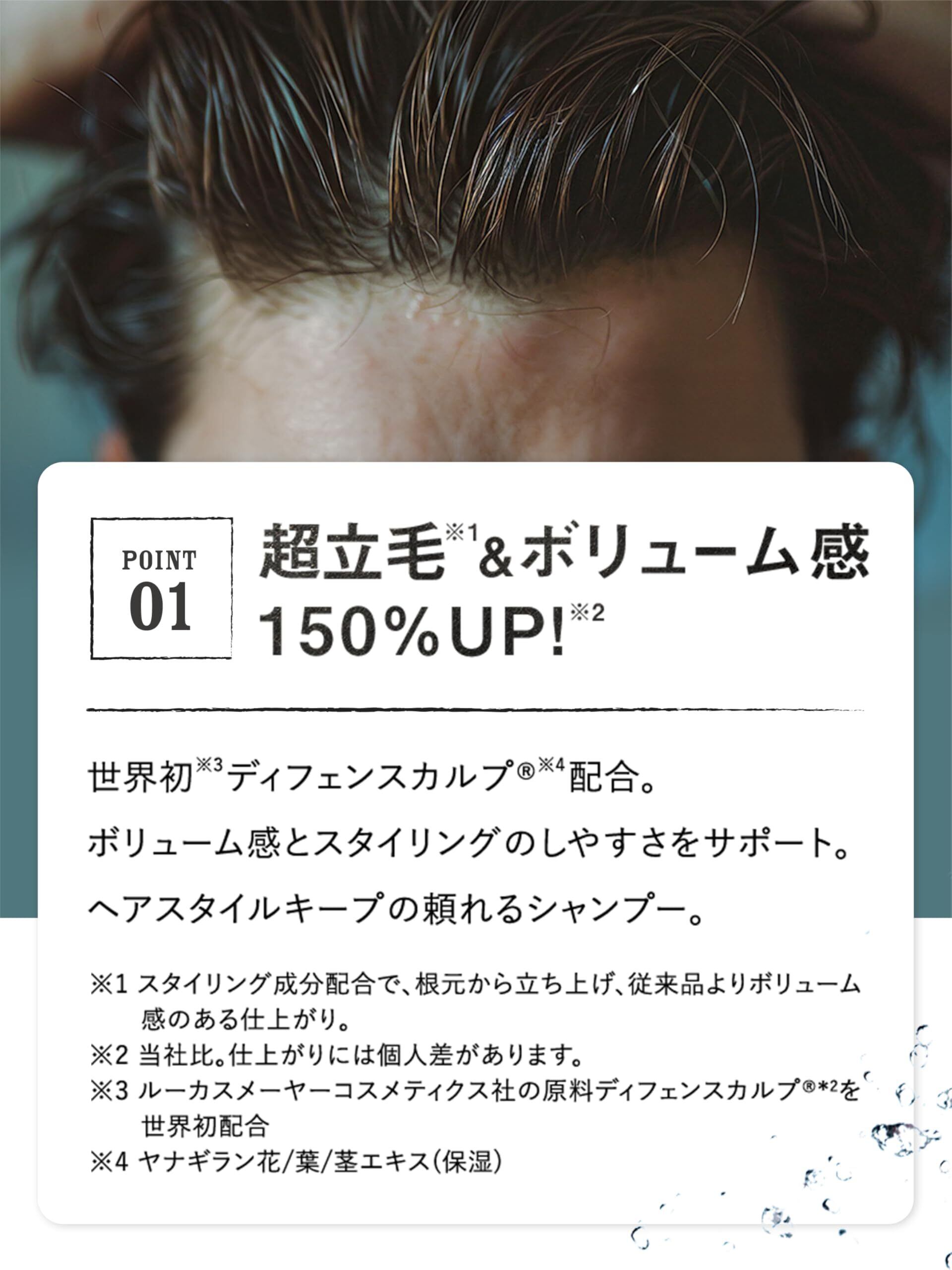 【ボリューム感】シャンプーに配合された美容成分が、まるでスタイリング剤のような働きをし、特徴的な使用感を実現。洗い流すときに泡の中から、スタイリング/ヘアボリューム成分が髪全体を薄いヴェールで包み込み、根元から立ち上がる髪へ導きます。